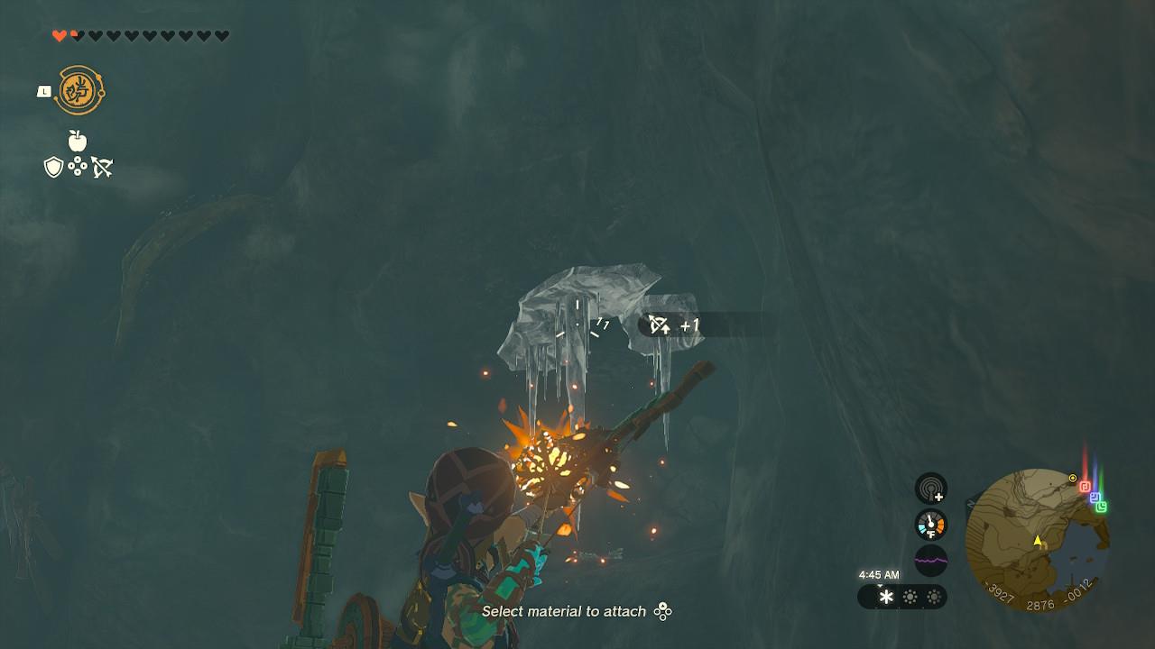 The room you want to get into is on the right side of the cave, seen above. There are ice stalactites blocking the entrance, but you can get rid of them by combining a fire fruit with an arrow. Or if you have a bomb flower, you can get rid of them and take out the next obstacle with one shot.