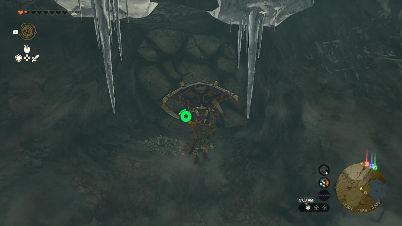 • The cave entrance is at the icy pool where the river begins; map coordinates are roughly (-2890, 3090, 0200) on the north end of Hebra Headspring.โ€‹