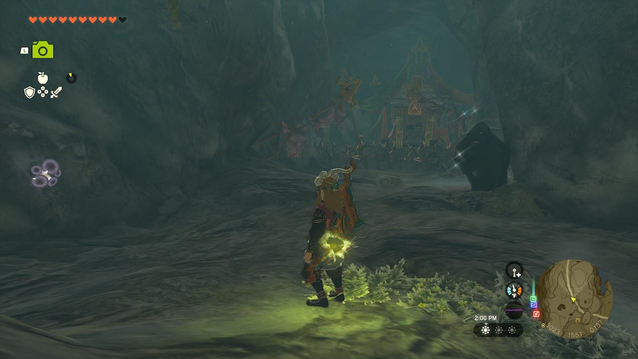 (If you’re curious about the two characters chatting right outside the cave, they will ask for 10 brightcaps. You can easily pick these up inside the cave if you don’t already have that many on you. The reward is a Spicy Tomato Mushroom Stew, which grants five and a half minutes of cold resistance. This completes the “Cave Mushrooms that Grow” side quest.)