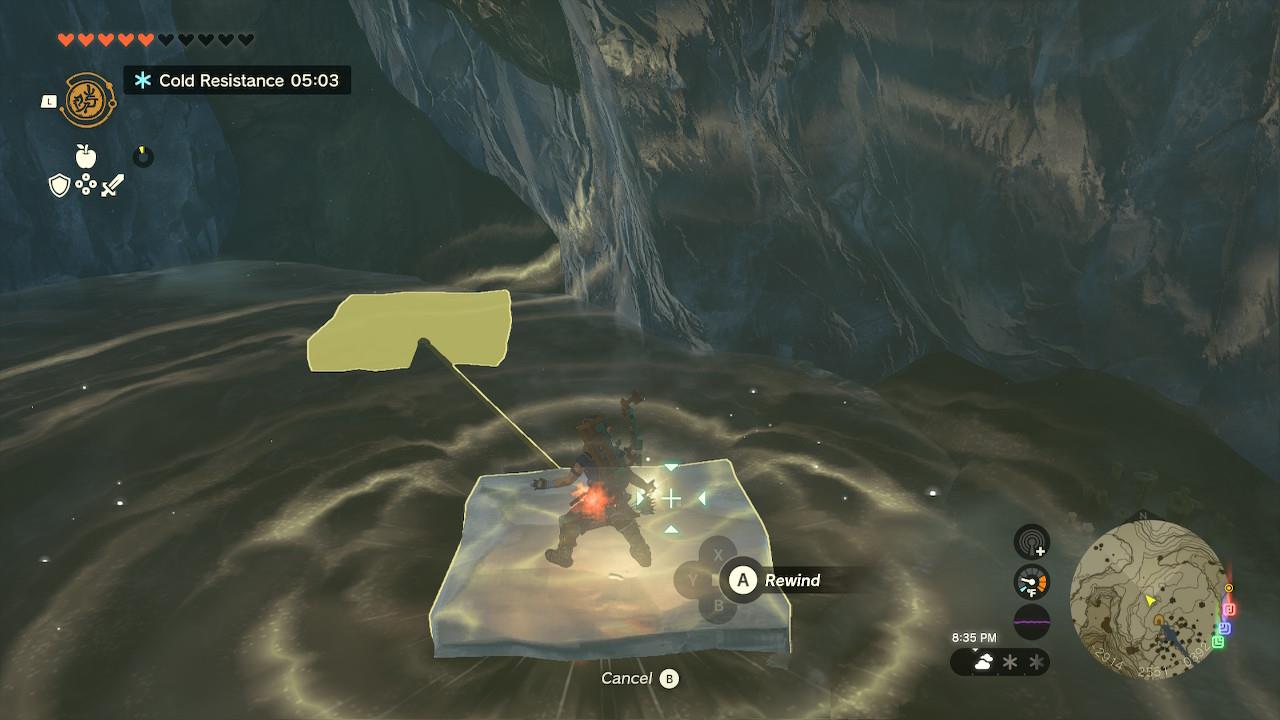 Then, jump and paraglide to the other side. Next, throw a white chuchu jelly at the water to create an ice platform (an ice fruit will do the work just fine, too), aiming right below the wall that leads to the treasure room.