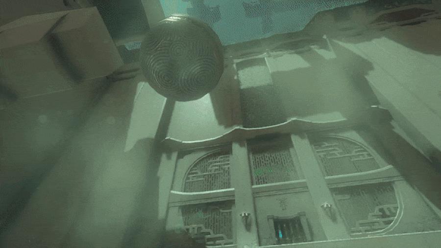 1. Run down the ramp to see a giant bobbing platform and a boulder bouncing along it. Above the boulder is a target, and each time the boulder passes, it isn’t bouncing high enough to hit the target. Run to the platform and stand on the open square to the side of the ball. You’ll need to use Recall at just the right moment to send the ball flying up toward the target.