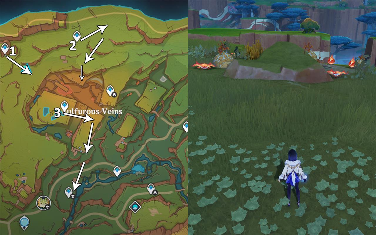 The first part of the farming route yields 12 Embercore Flowers. Starting from the teleport waypoint northwest of the Sulfurous Veins, glide to the southeast and look for the first Embercore Flower on the ground below you, next to some bushes.