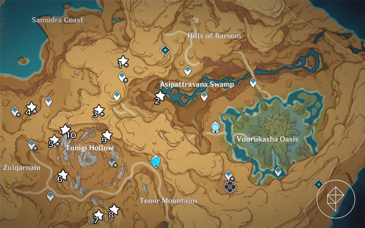 The tenth Fravashi Tree sits atop a rocky outcrop in the southern part of the Vourukasha Oasis, just east of the teleport waypoint near the Mausoleum of King Deshret. Climb the jagged cliffs from the nearby riverbed or glide down from higher plateaus to reach it. Activate the tree by interacting with its glowing branches, which summons Dendro particles and reveals a nearby puzzle with invisible walls. Solving the puzzle grants 3 Phantasmal Seeds along with some Adventure EXP and Primogems. Mark this spot on your map to avoid backtracking during the quest.