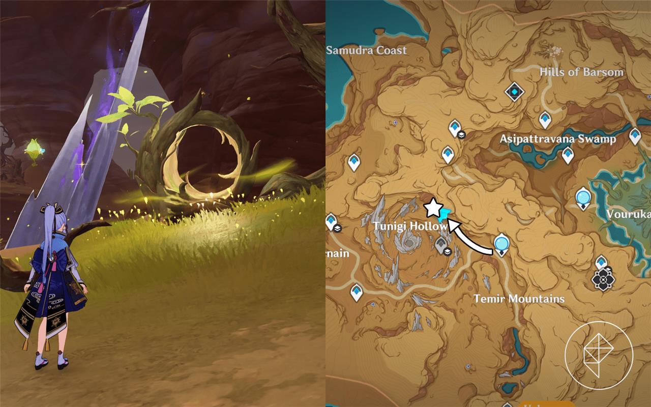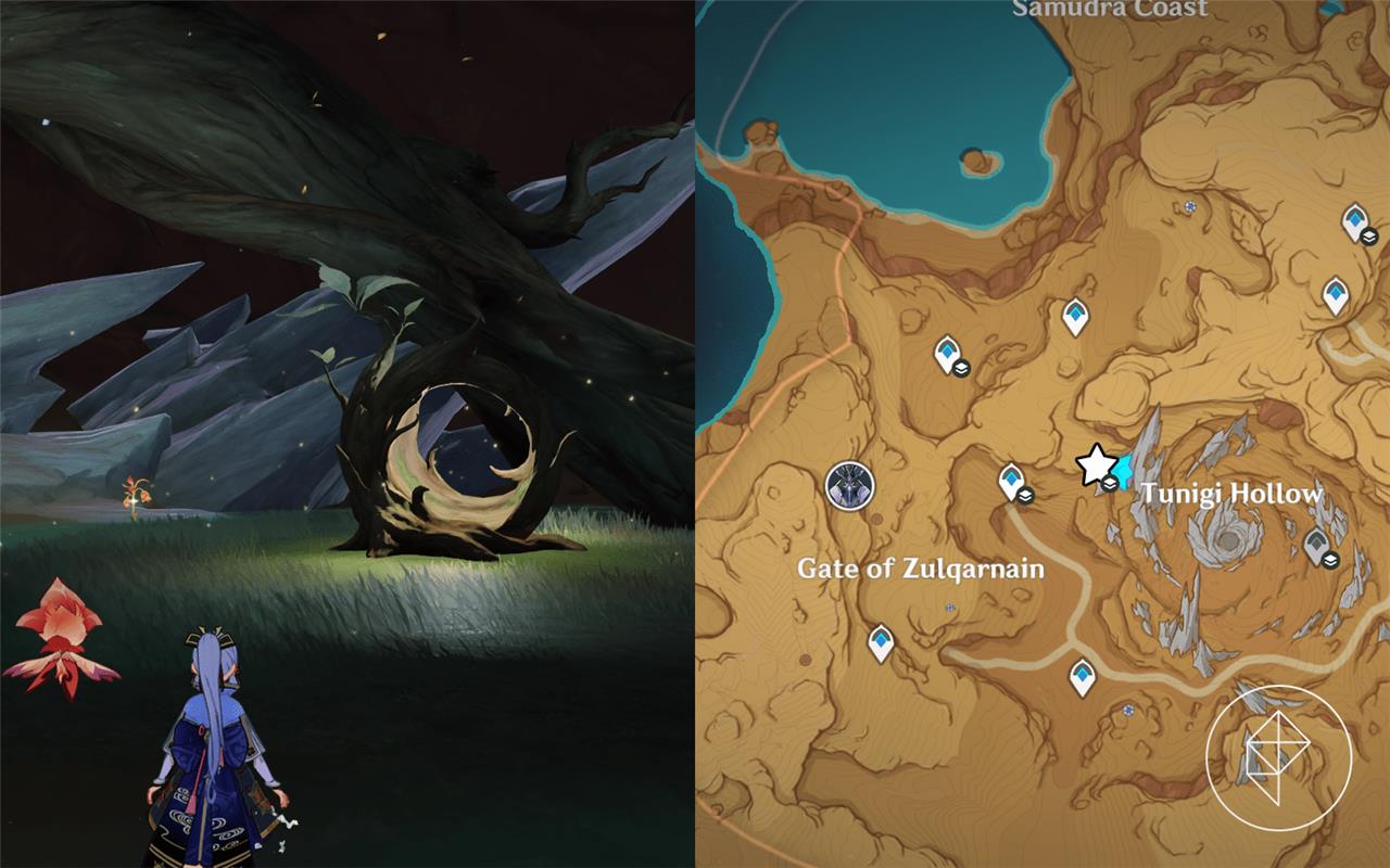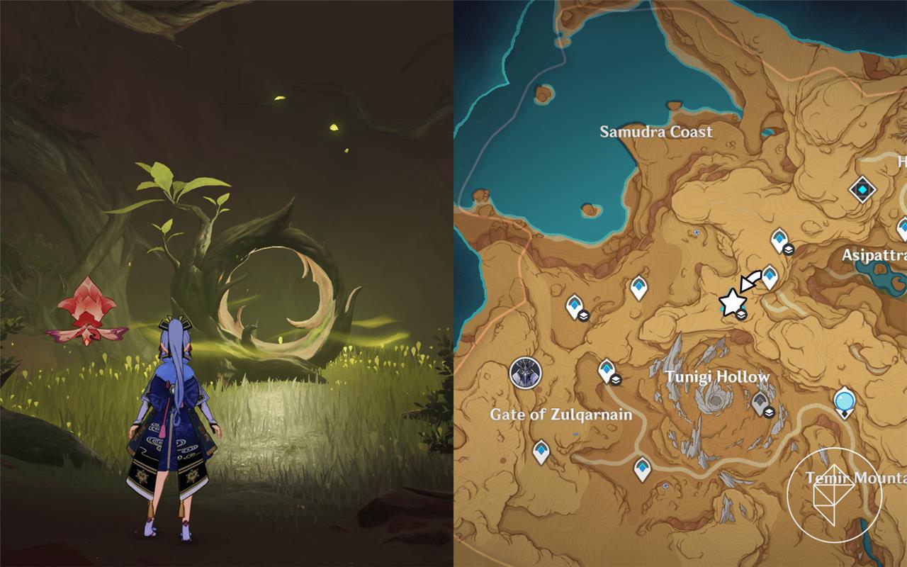 Fravashi Tree 4 is found near the Tunigi Hollow area in Sumeru’s Gavireh Lajavard region. Glide down from the nearby teleport waypoint and look for a small clearing with several floating Dendro particles. After interacting with the Fravashi Tree, use a character with Dendro ability to trigger the surrounding energy orbs and awaken the spirit within. Completing this step will provide one of the required fragments for the related world quest.