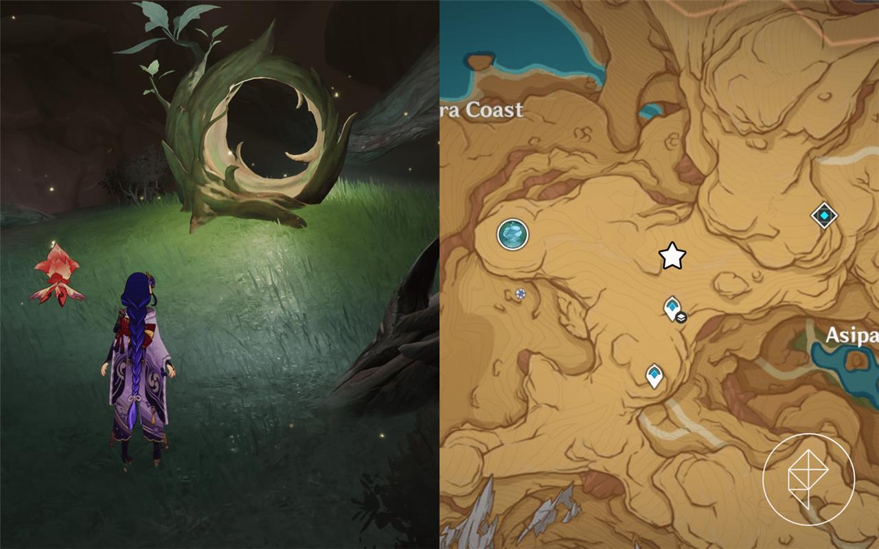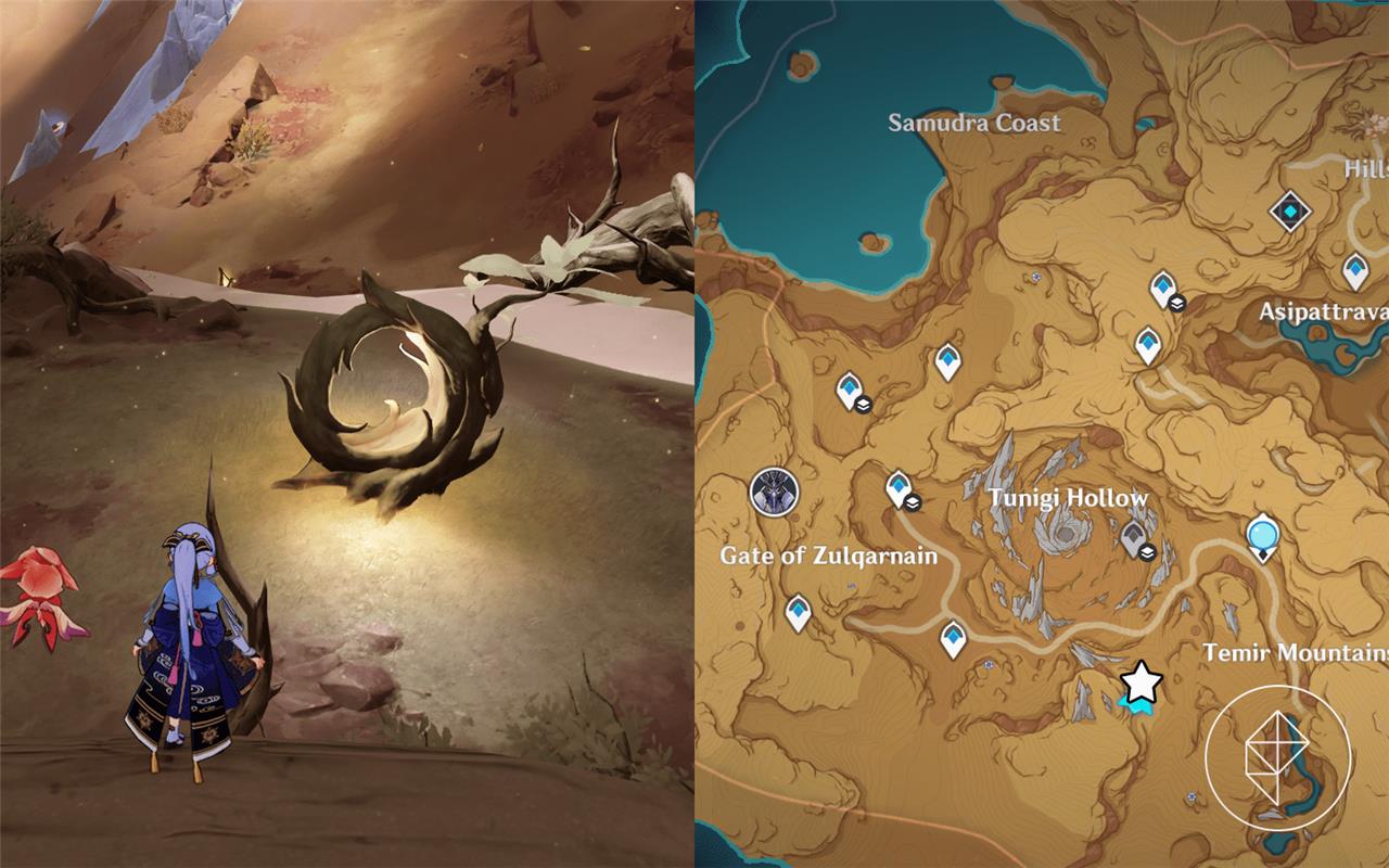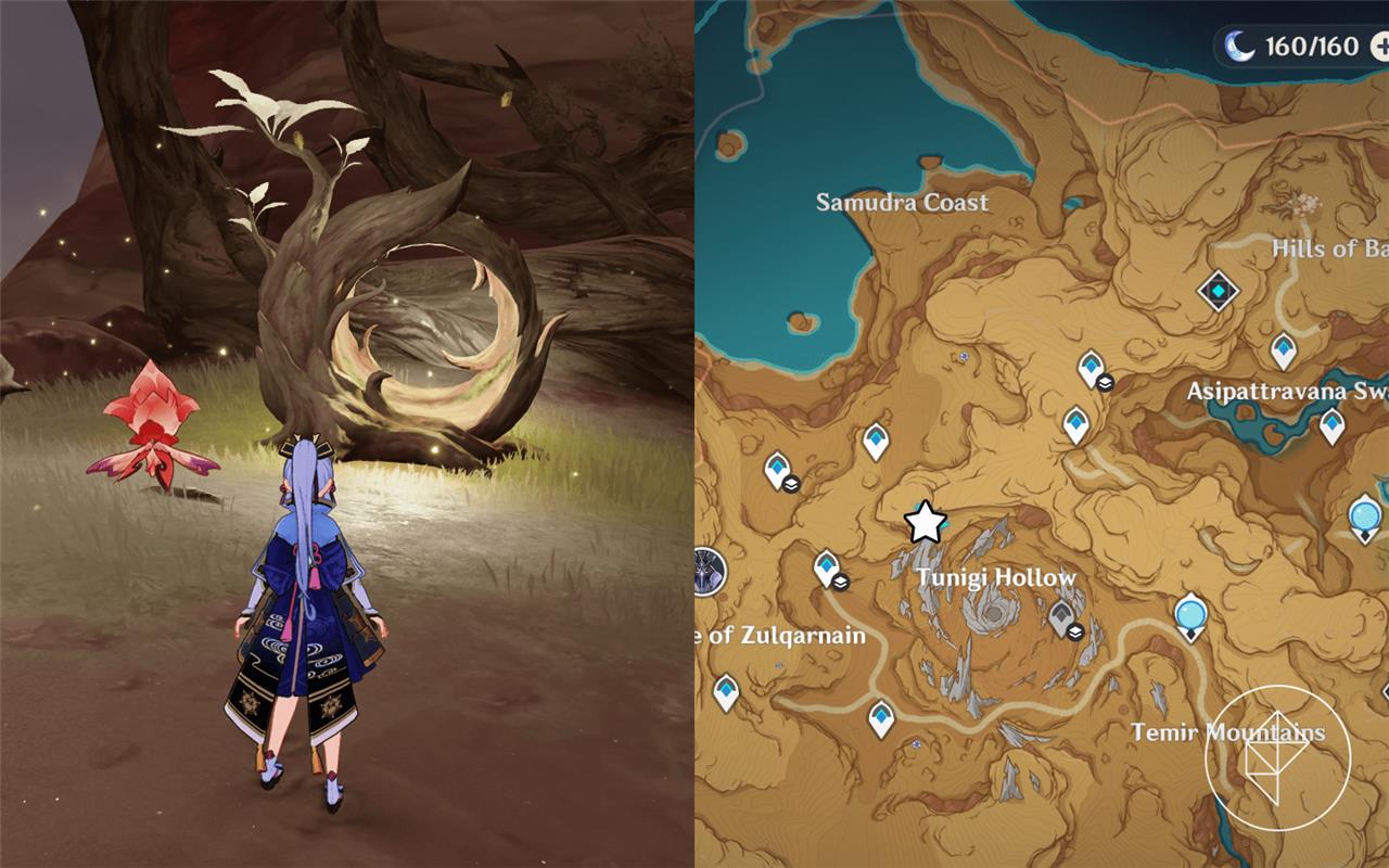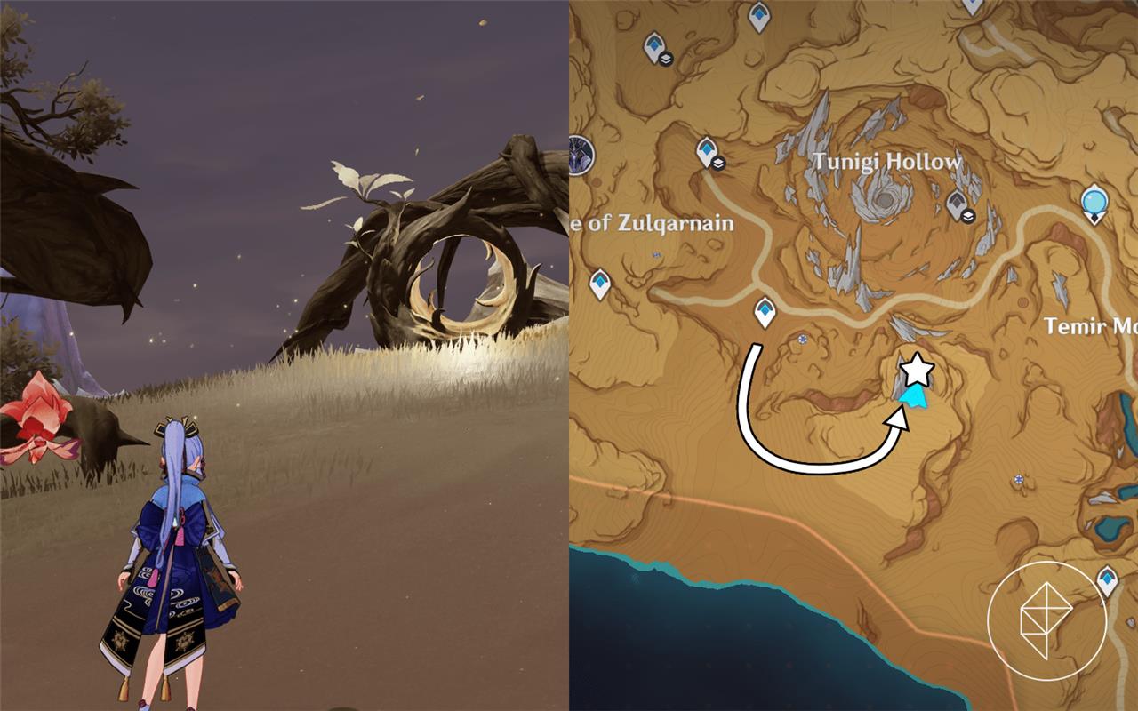 Fravashi Tree 4 is found near the Tunigi Hollow area in Sumeru’s Gavireh Lajavard region. Glide down from the nearby teleport waypoint and look for a small clearing with several floating Dendro particles. After interacting with the Fravashi Tree, use a character with Dendro ability to trigger the surrounding energy orbs and awaken the spirit within. Completing this step will provide one of the required fragments for the related world quest.