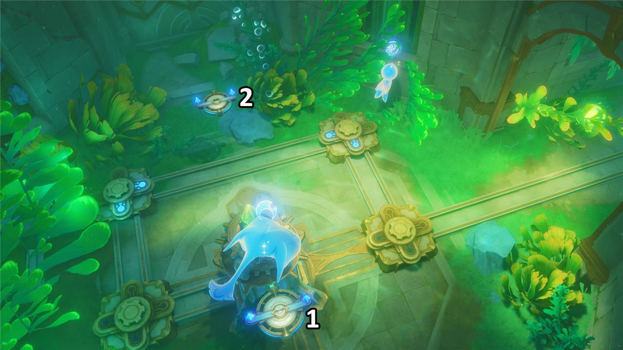 16. Here’s how to solve the floor puzzle: Use the xenochromatic ball octopus ability on mechanism 1 (see picture below) until the floor tiles on the bottom row are glowing. Next, use the octopus ability on mechanism 2 until the upper row is glowing as well. Press “release” on the fountain-like mechanism to start the water flow.