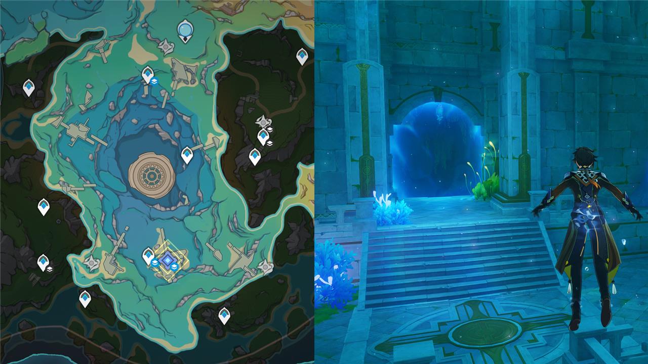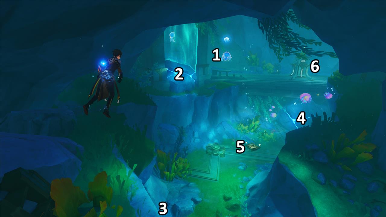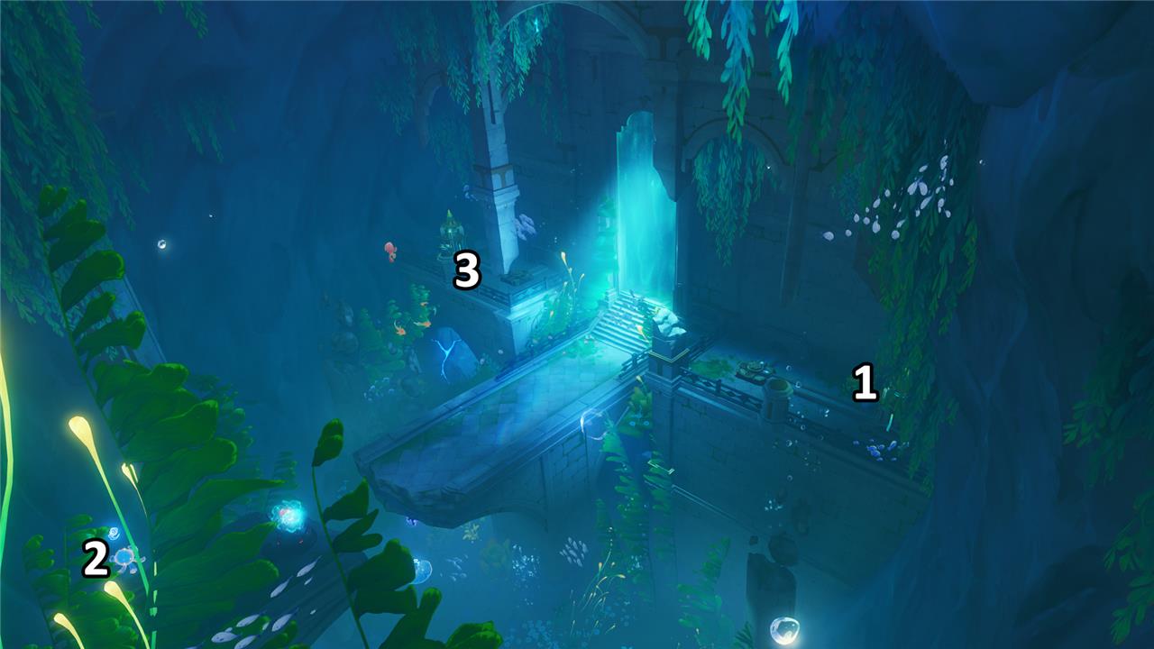 4. This brings you to the center of the orthant’s puzzle, which already has three working streams by now. To fix the rest of the puzzle, dive down as far as you can and follow the underwater tunnel.