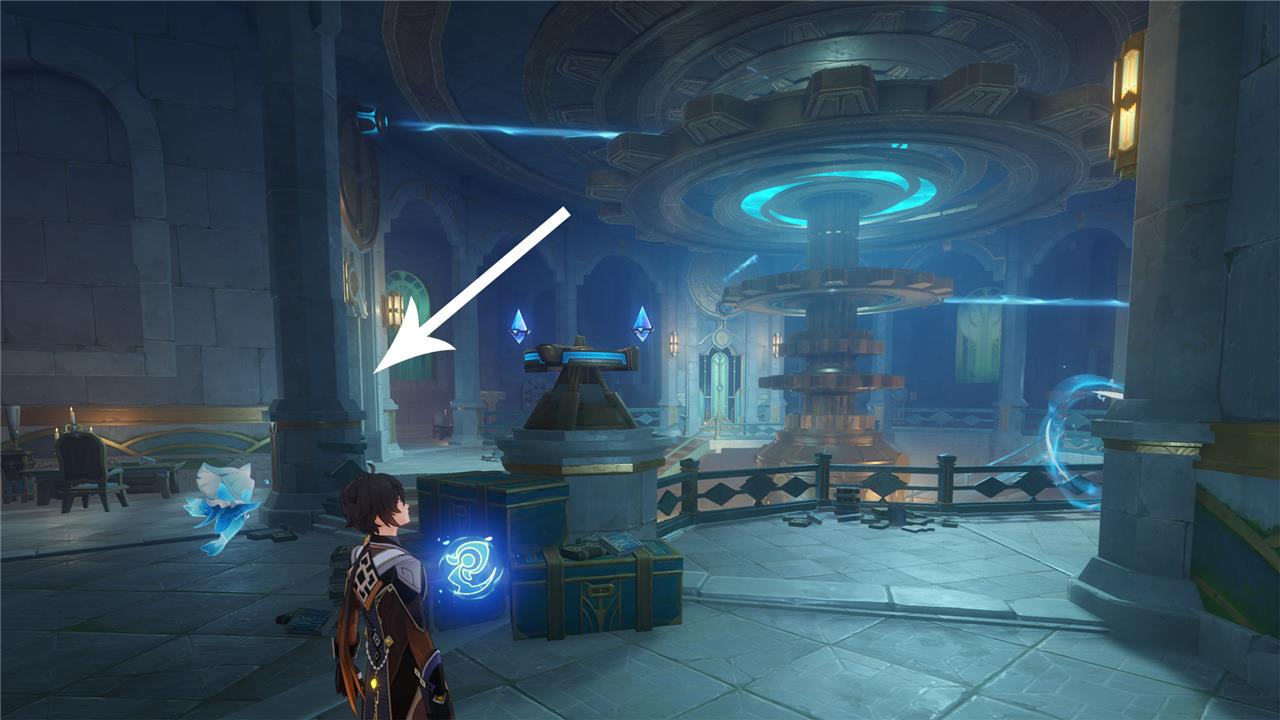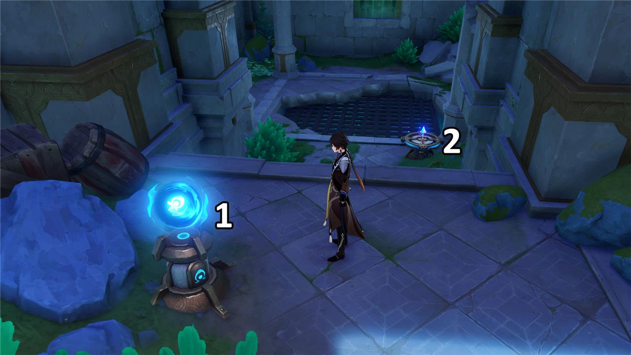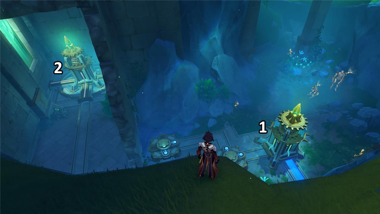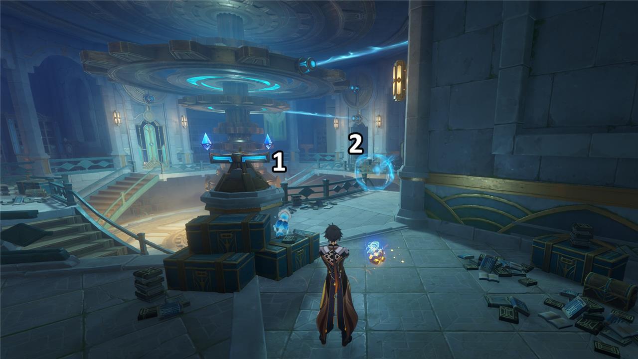 6. Pick up the two tiny blue orbs from location 4, and use them on the mechanism in location 5.