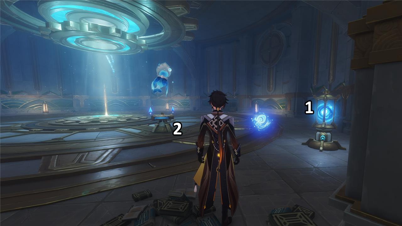 2. Defeat the enemy, which will cause the two orbs to fly over to the left side of the room, and activate the xenochromatic ball octopus’s ability (step 1 in the picture below), which is near the door.
