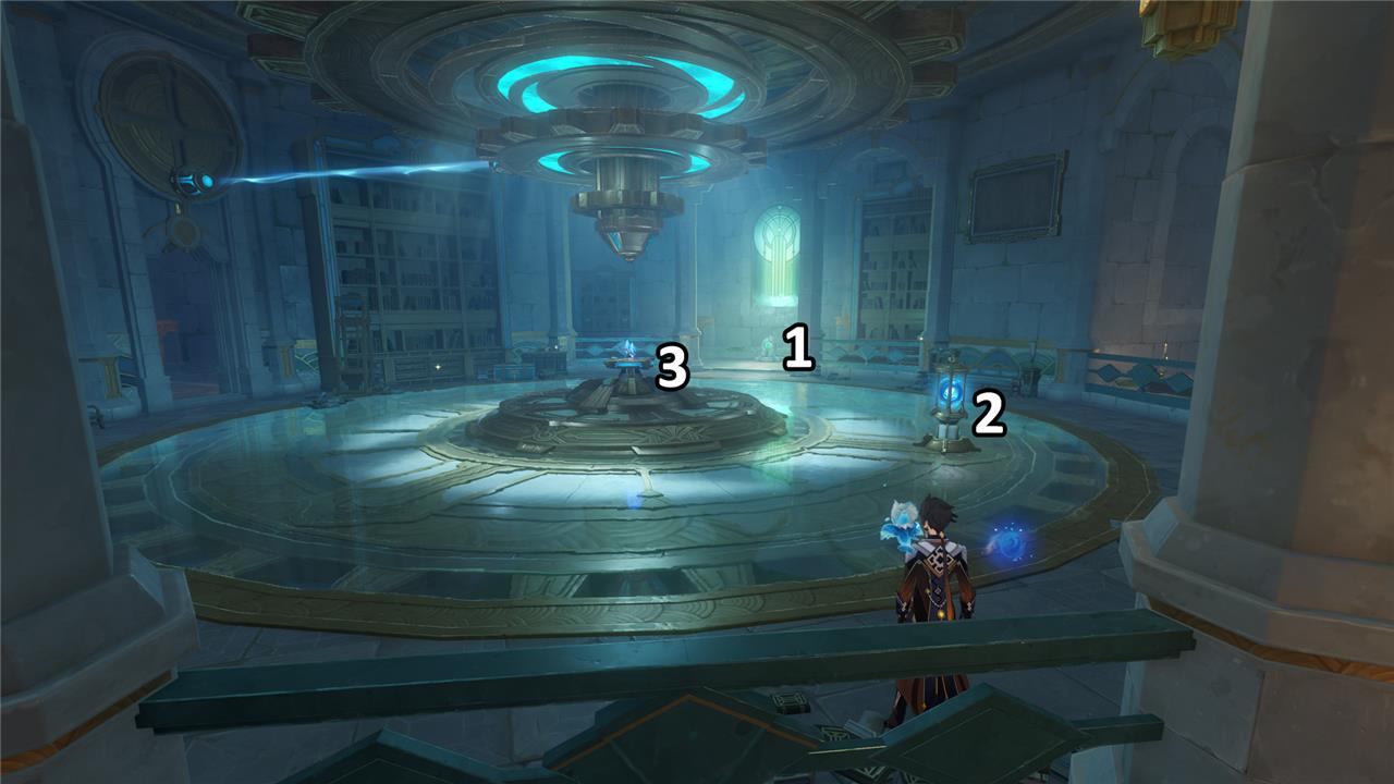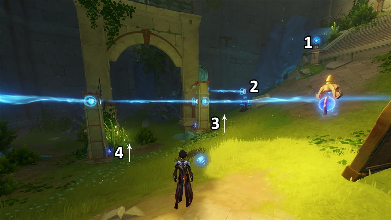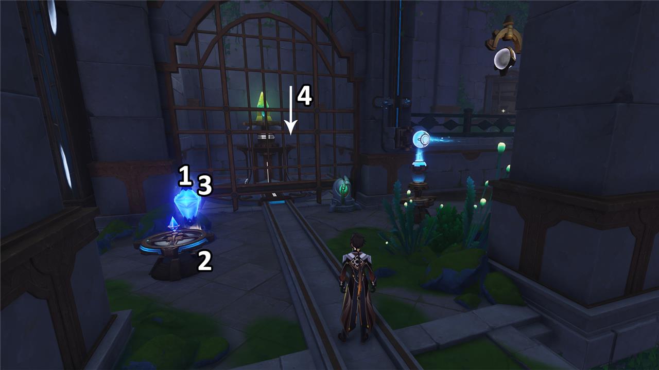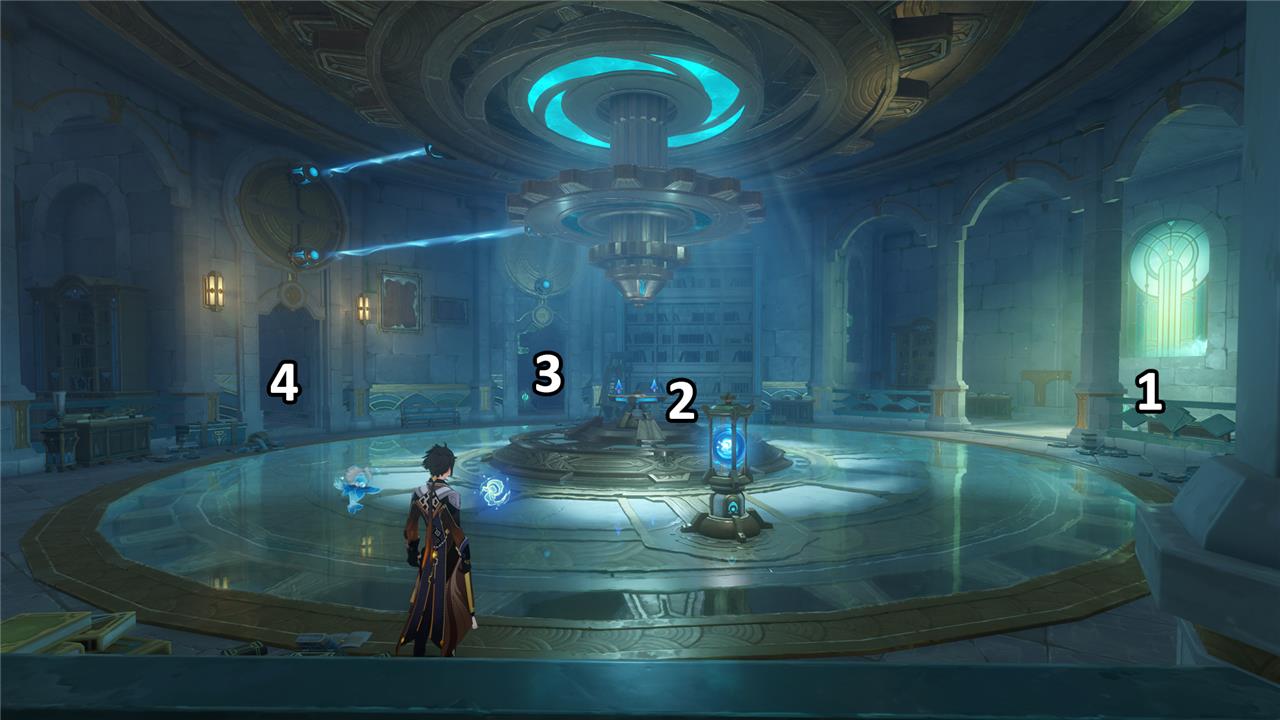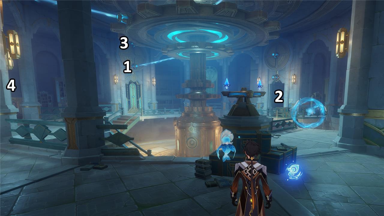 9. For the second part of the puzzle, interact with the mechanism at location 1 (see picture below), then turn the mechanism at position 2 until the laser hits the orb. Next, interact with the mechanism at location 3 and turn the one at position 2 again, until the second laser also hits an orb. This will open the door at location 4.