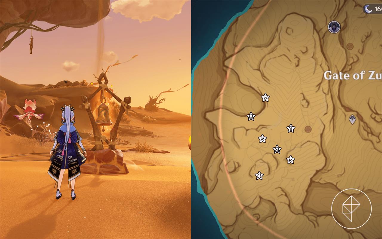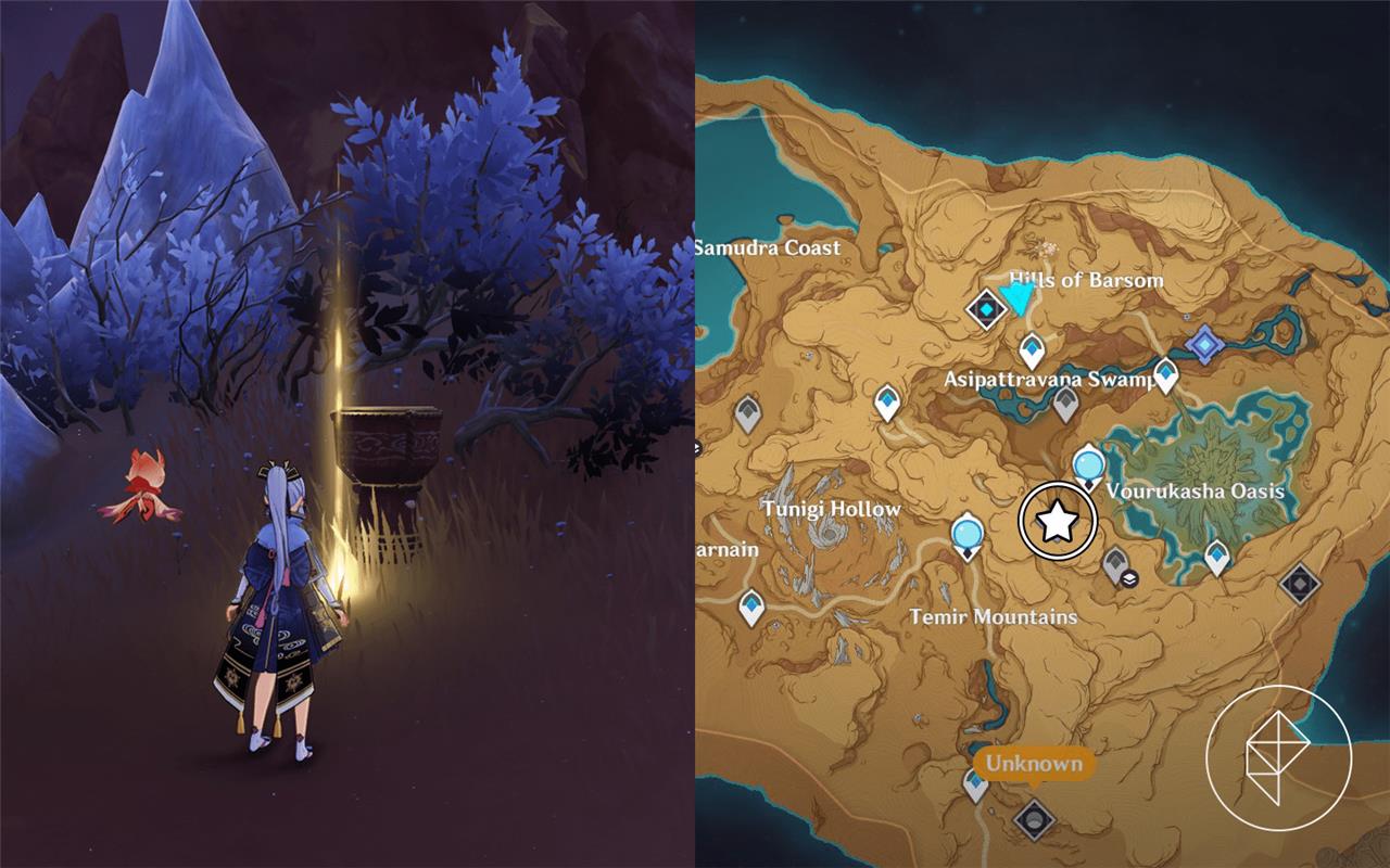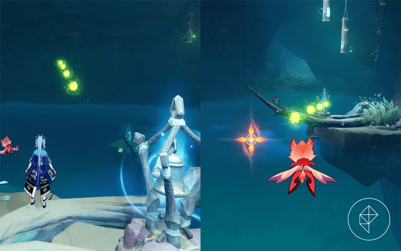 Samjna (Submerged Waves): Above Vourukasha Oasis; use Sorush to reposition sigils and collect Dendro particles via three bells.