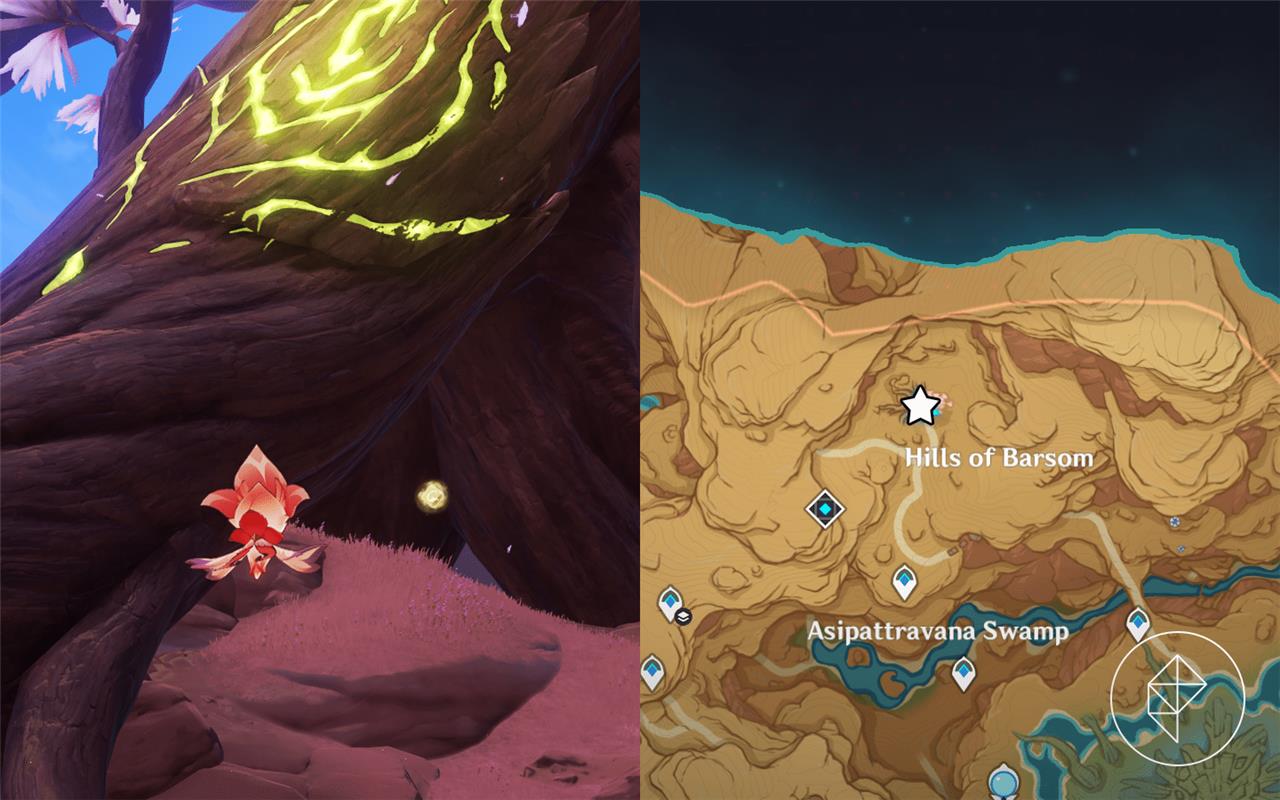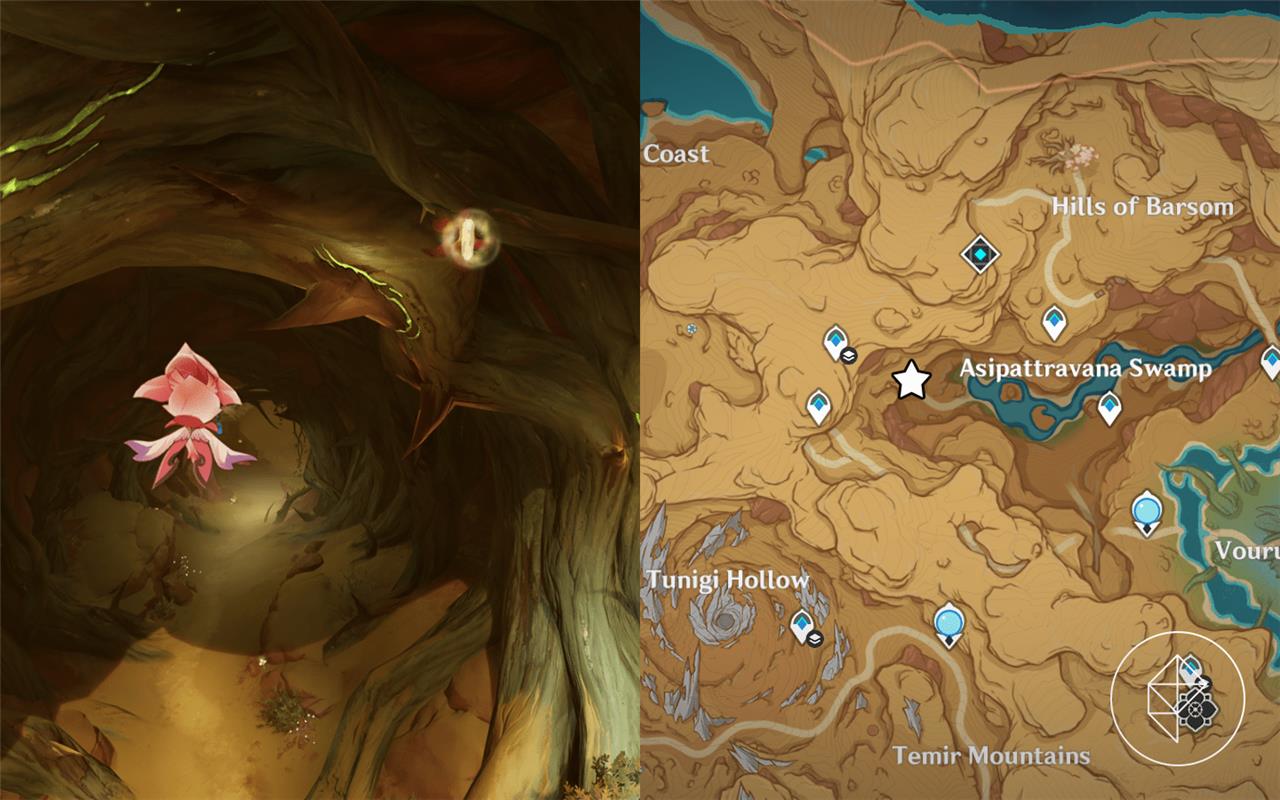 The second Lost Monument Fragment can be found at the top of the cave entrance on the left side of the Asipattravana Swamp. For a more precise location, head to the location marked by a star in the image above.