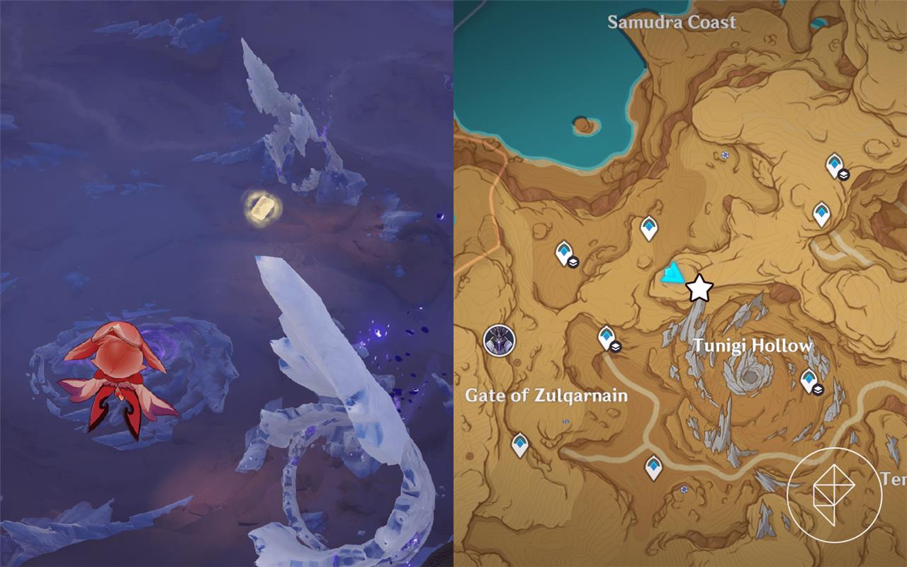 The second Lost Monument Fragment sits atop a rocky outcrop in the northern part of the Valley of the Fallen Water, Fontaine. Climb the jagged cliffs east of the central waterfall, using nearby Four-Leaf Sigils for quick boosts. From the outcrop, glide southeast to spot a small cavern entrance glowing faintly with purple light. Enter the cave and follow the narrow path upward; the fragment appears on a ledge near a cluster of Ruin enemies. Clear them first to collect it safely.