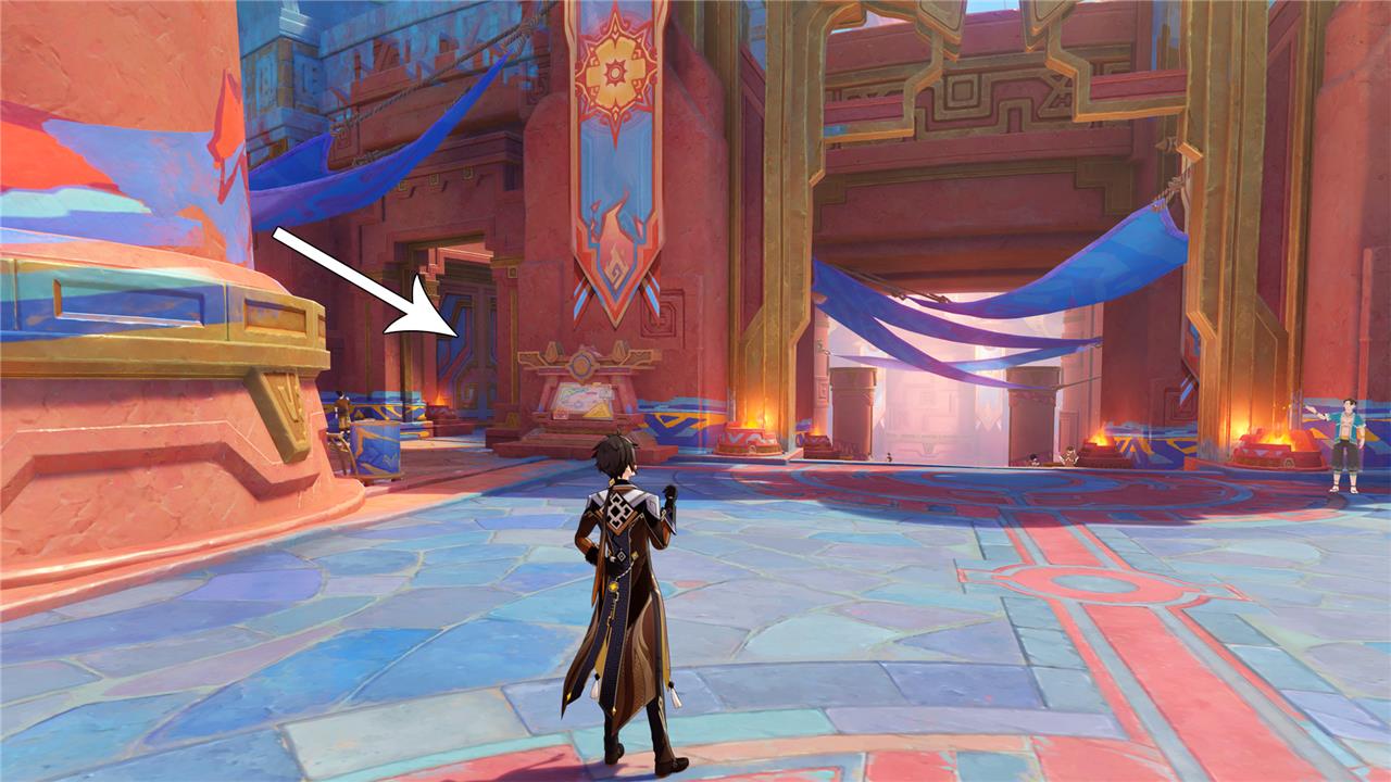 Upon arriving in the city (via the eastern teleport waypoint), don’t go into the circular arena ahead of you, but take the seemingly locked doors on the left – they’ll swing open as soon as you approach (see picture above).