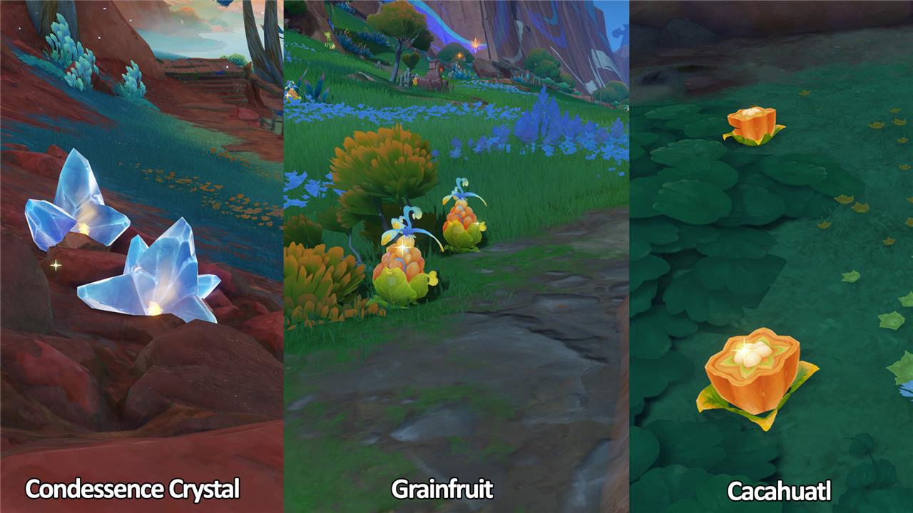 Cacahuatl also spawns everywhere in Natlan but it’s not quite as common as Grainfruit. One excellent farming location is directly north of the Sanctum of Rainbow Spirits Domain, in an enemy camp at the edge of the cliff. After collecting six Cacahuatl there, glide down towards the north; the enemy camp below you contains eight Cacahuatl plus a few bonus Grainfruits.