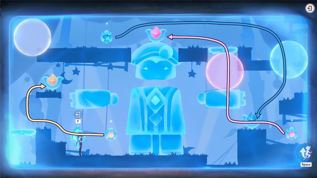 After completing Secret Summer Paradise: Part II, head to the Pavilion of Hermits and interact with the two Streaming Projector puzzles in the surrounding area, each tied to a trapped Hydro Eidolon inside a preprint or projector stage. Solve both projector setups by placing the colored Brilliant Mirrors or jewels into their matching receptors to clear the stages and spawn Precious Chests, then open these to free the Hydro Eidolons so they travel back to the main tent. Once both Water Droplets have reached the circus tent, their combined power will dispel the yellow barrier around the luxurious chest in front of the pavilion, letting you open it for Primogems, a Joyeux Voucher, and other event rewards.โโ