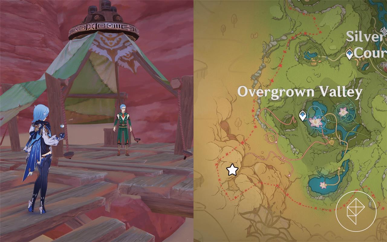 The magic bottle’s external position aligns with the Desert of Hadramaveth in southern Sumeru, specifically in the southern swirl above “Wadi Al-Majuj” on the map (near the stream area, but no interactable bottle appears post-event). Players cross-reference cutscenes to pinpoint it during the quest.โ