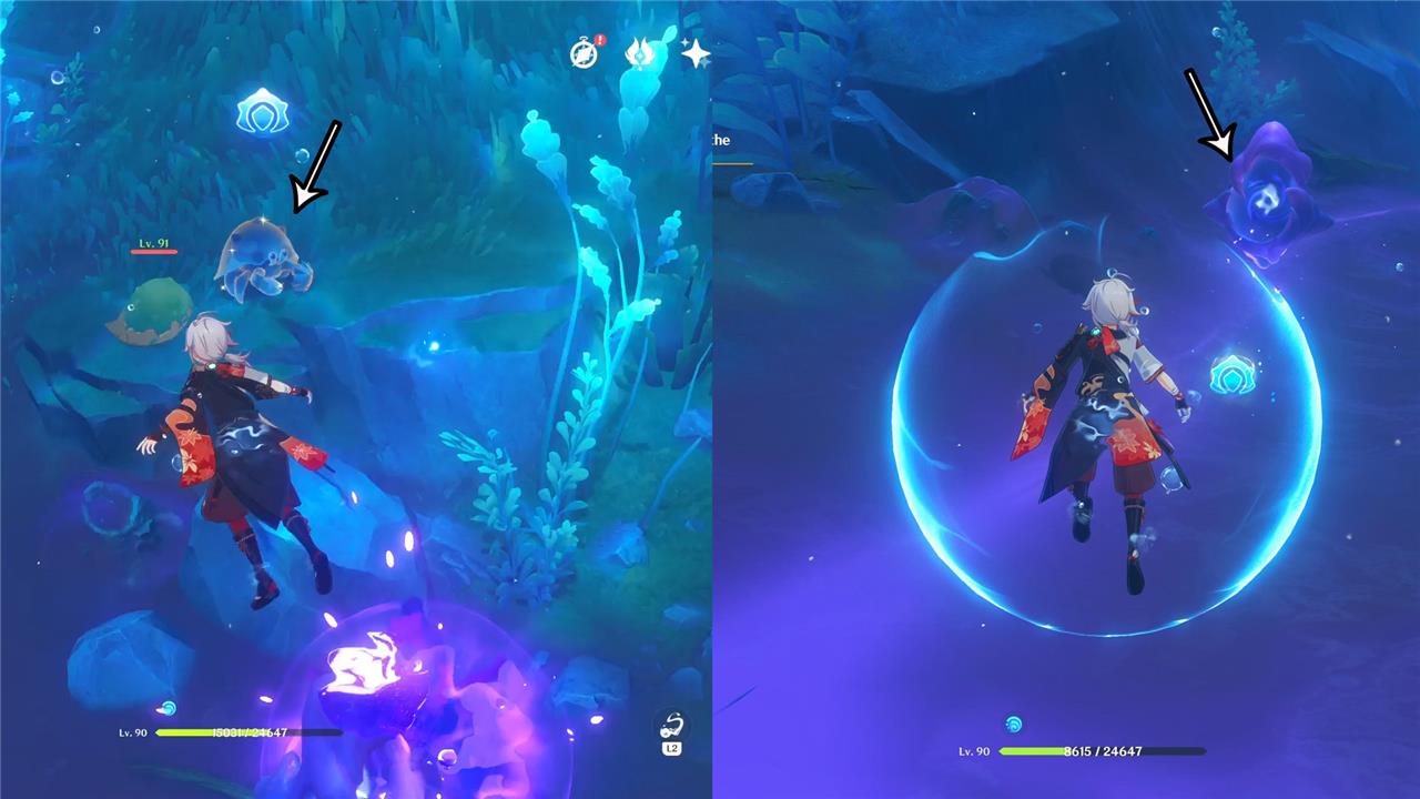 Underwater, you can find three purple totems moving toward the same point. If you get too close to them, they will attack you. Even though you have learned to use the Ball Octopus ability to cleanse these totems, this time you need to use the Armored Crab ability since it is the only one available in the region.