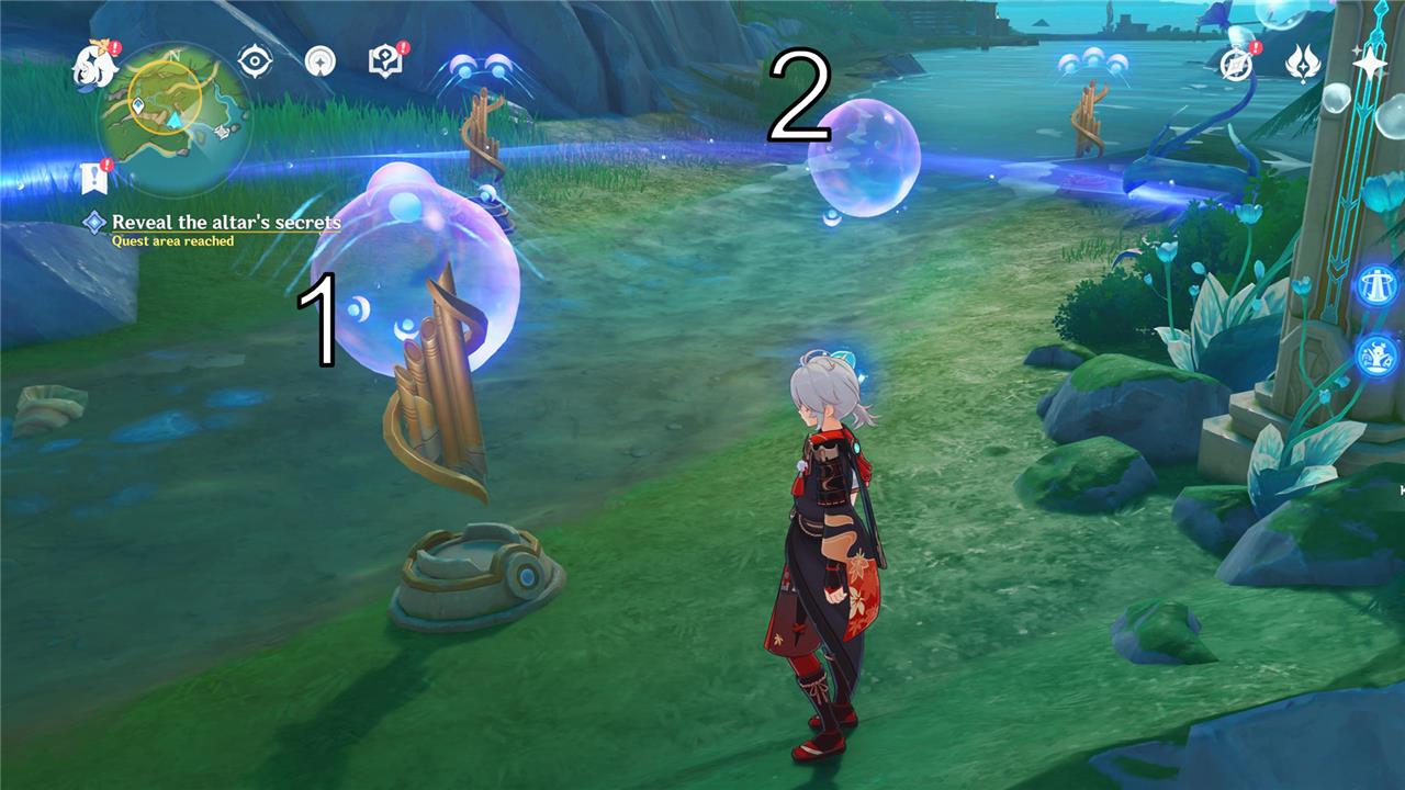 The second puzzle is closer to the altar, where you will find a couple of totems to cleanse. Doing so makes one bubble appear between two pipes and one bubble comes out of a device. This time, there are three Harmonious Reed Pipes and all of them must be activated at the same time. As before, you need to use the bubbles to do so.