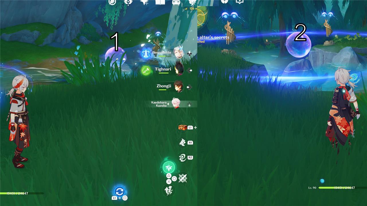 The first puzzle is in the southeast and it has a totem for you to get the Xenochromatic Ball Octopus ability. Use the ability to cleanse the purple totems in the area. Two dew bubbles will appear. Your mission is to place the bubbles to activate all the pipes in a specific order. To solve this, put one bubble closer to the first pipe, and the second bubble between the second and third pipe. Then, attack the bubbles following the order of the pipes – see the image below.