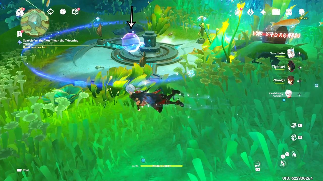 At the bottom of this region, there are three Harmonious Reed Pipes. Two of them must be activated first and at the same time. Use the Ball Octopus ability to push one of the dew bubbles to the pipe to the center, closer to the two pipes that must be hit by the wave first. Pop the bubble to get the key and an Exquisite Chest.