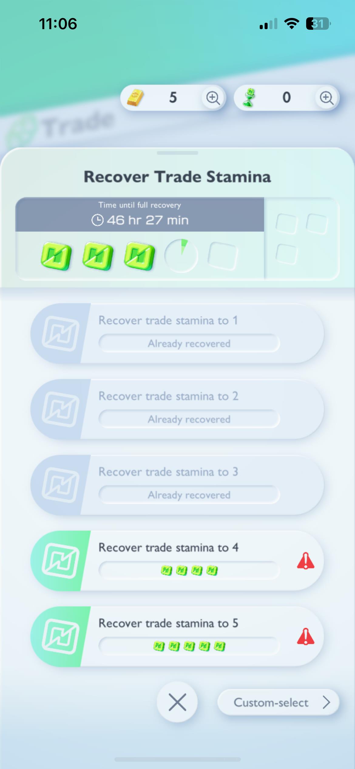 The first way to recover Trade Stamina is simply to wait. It takes 24 hours for one unit of Trade Stamina to recover.
