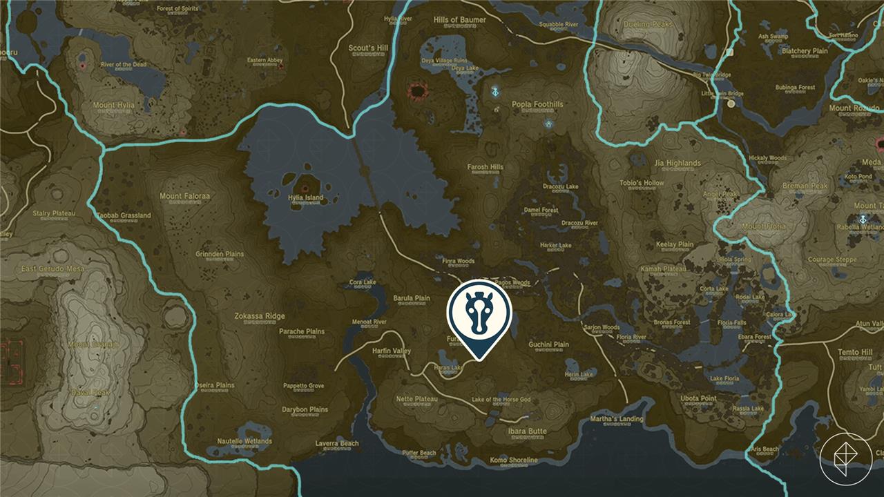 Padok from Highland Stable will tell you that the Giant White Stallion can be found at the Lake of the Horse God. To get there, follow the road southwest from Highland Stable and then take the first left. You should now be heading southeast. You’ll eventually cross the Horse God Bridge and then arrive where the Horse God Malanya was in Breath of the Wild (Malanya has moved to East Akkala Stable in the North Akkala Foothills in Tears of the Kingdom).