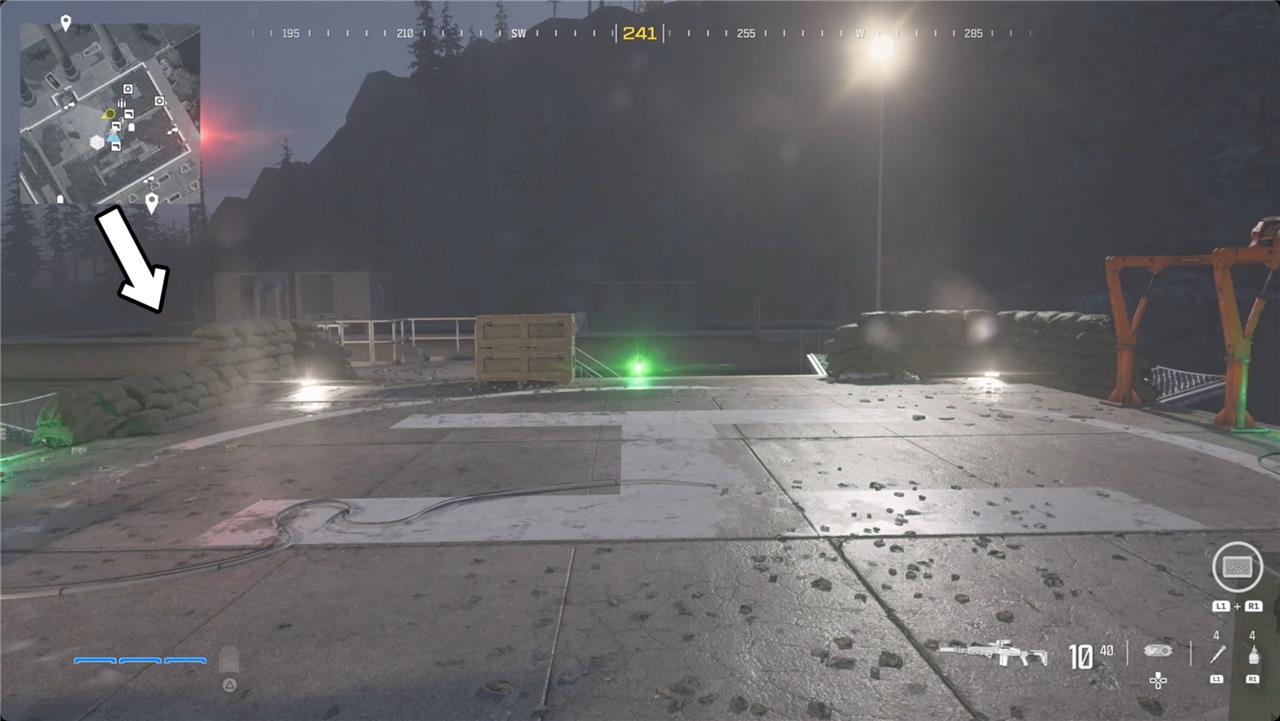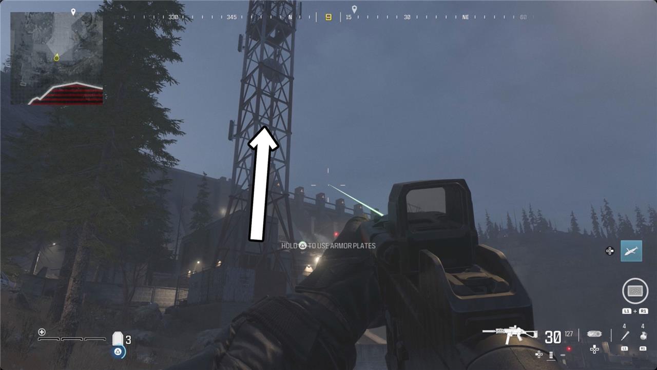 Head back to the northeast and get on the road again. Take the first right down the stairs toward the water. There will be a small radio tower on your left. Climb up to it and then ascend the rope running up the middle. You’ll find the MCPR-300 at the top.