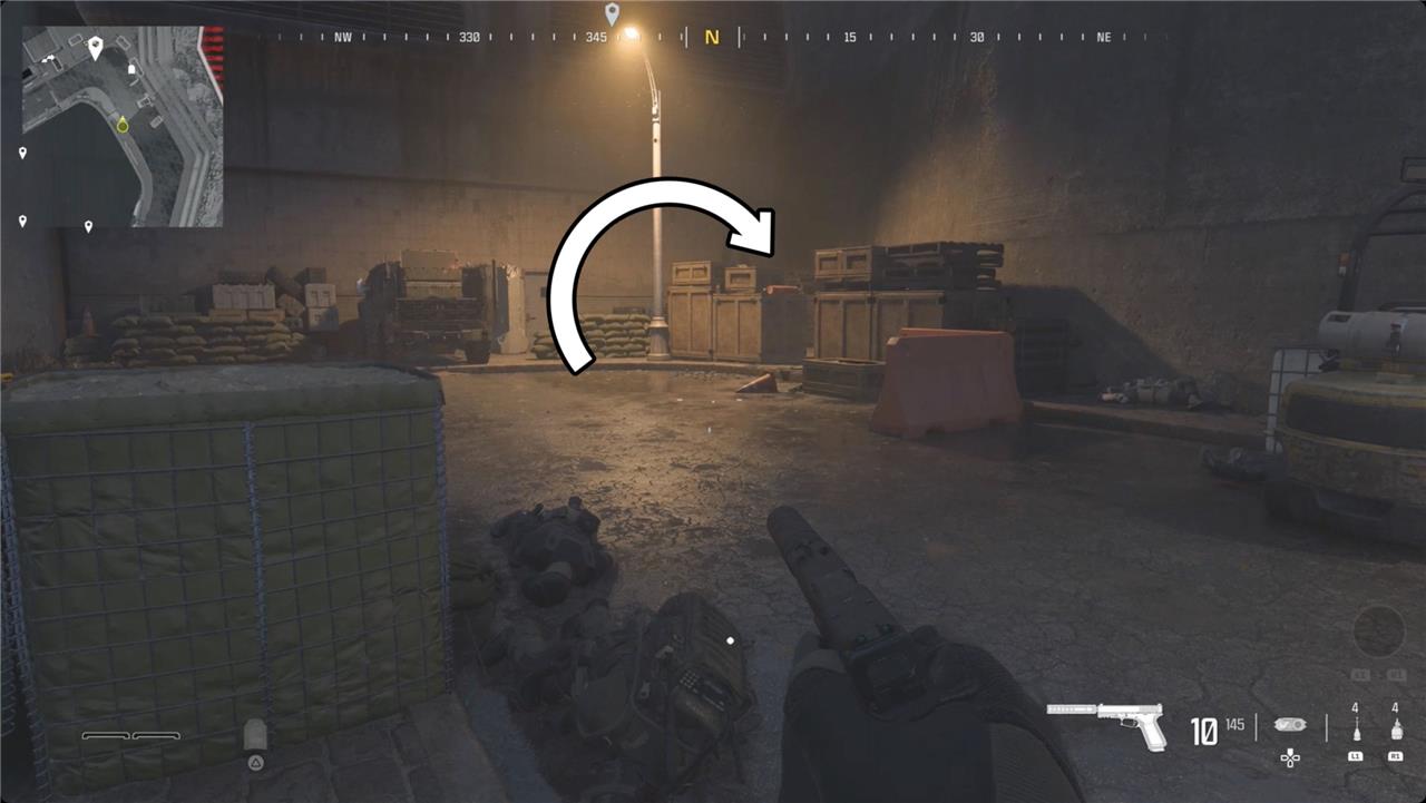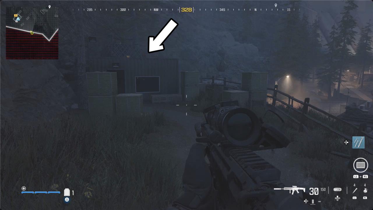 Keep heading southwest and climb up the rock wall to find a small shed-like building. There’s a supply drop sitting on the roof with the Silenced Striker.