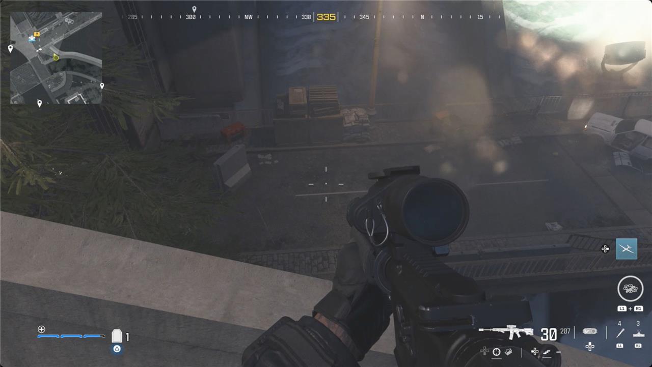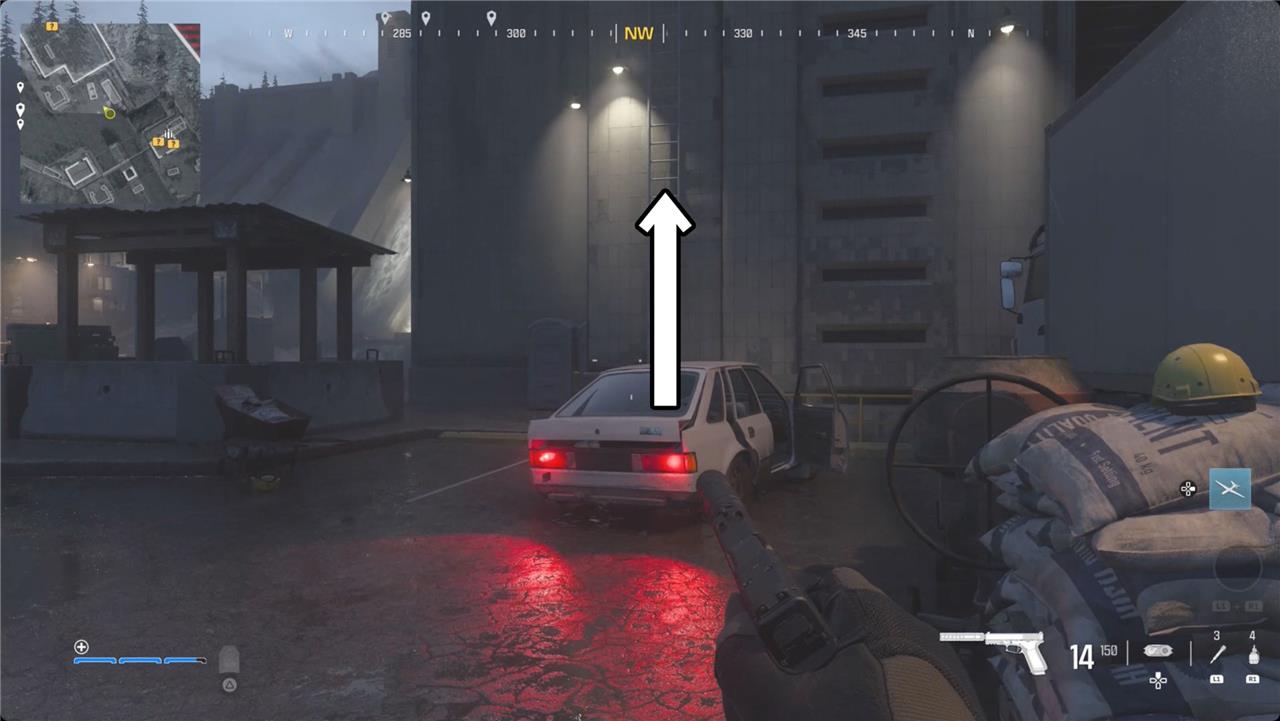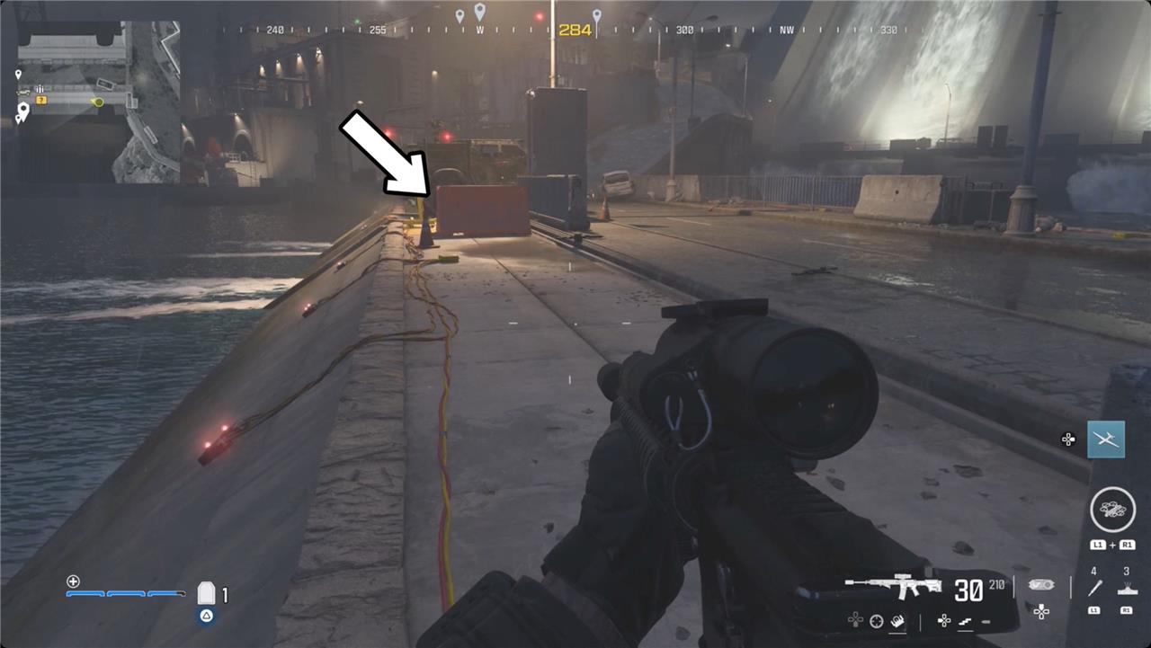 To the south, you’ll find a rope that lets you ascend back up to the bridge. Turn south and hop the low walls as you head toward the two-story building. Use the stairs on the north wall to climb to the second floor, go through the door at the back, and then use the boxes to climb to the roof. You’ll find the Silenced EBR-14 at the end of a zip line.