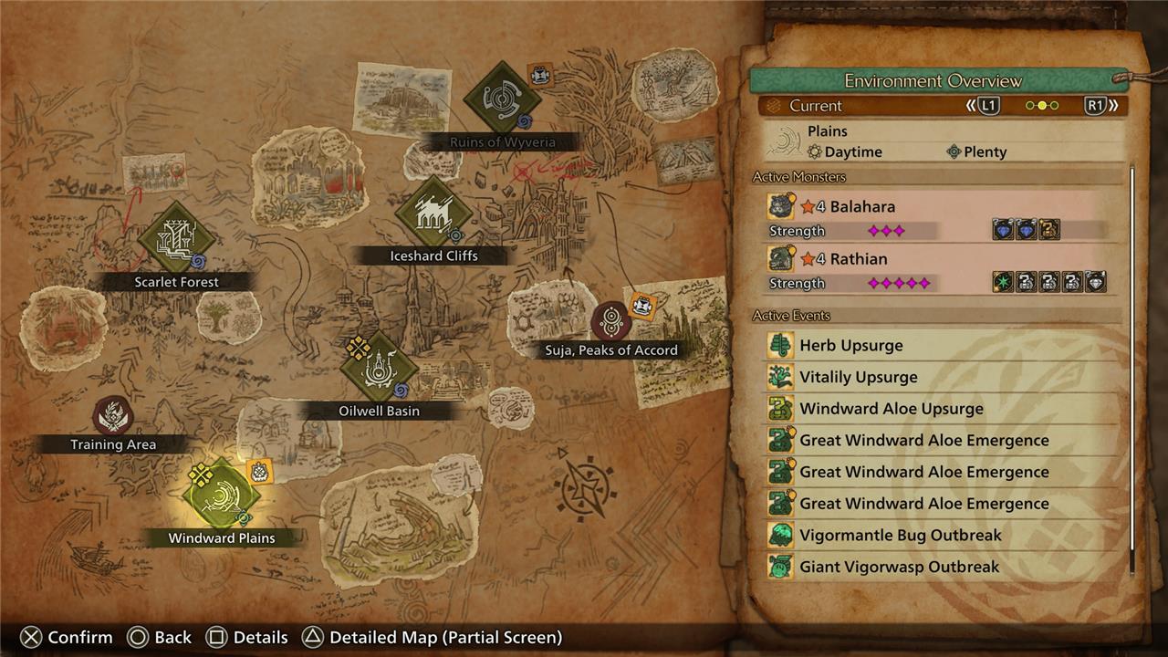 You can find Great Windward Aloe in the Windward Plains regions in Monster Hunter Wilds. Sounds easy enough, but it only spawns during a special Emergence Event, which is like a temporary weather event in the game. The Emergence Event is called the “Great Windward Aloe Emergence” and you can track it by checking the forecast in the Environment Overview in your main map. You can see what it looks like in the map forecast below.