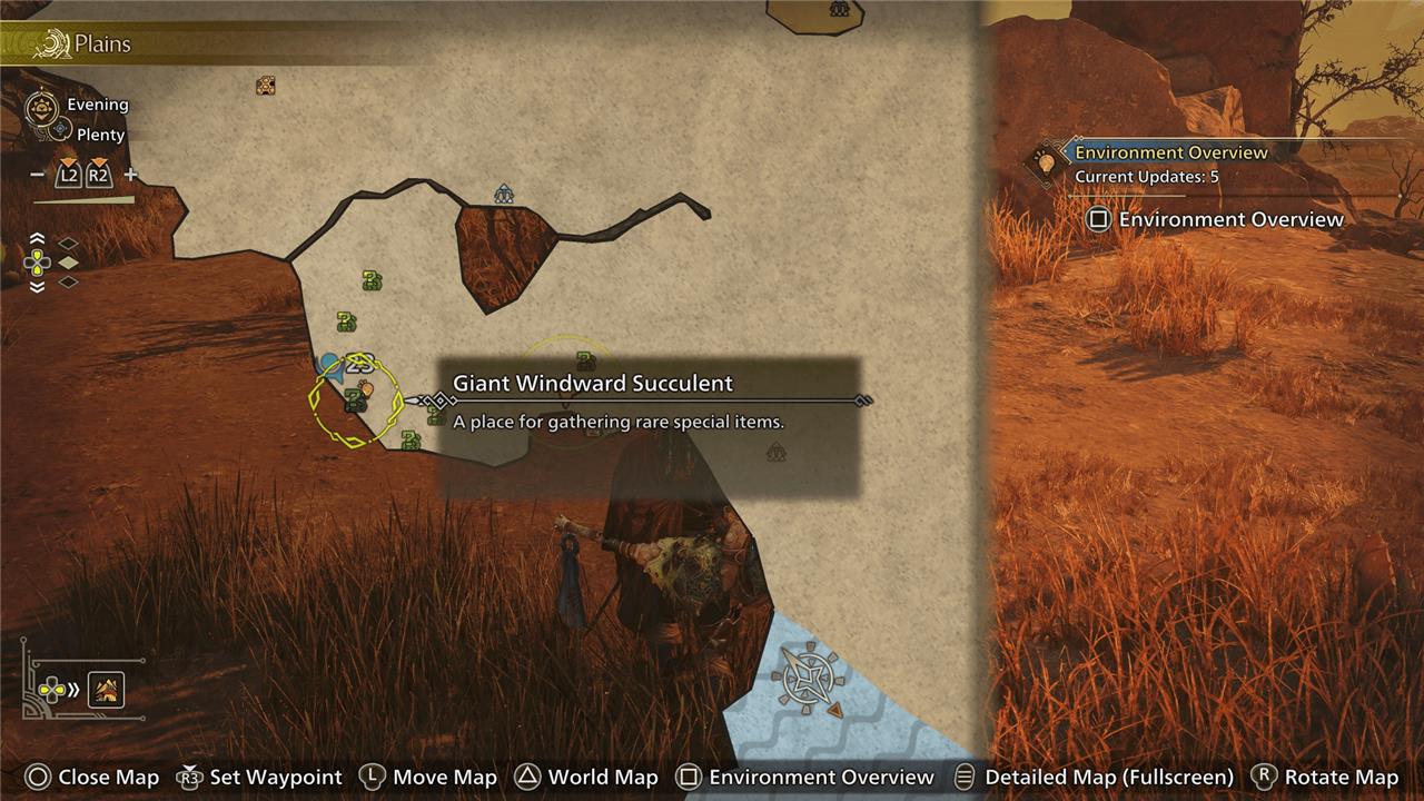 Great Windward Aloe can only be found in the Windward Plains region of Monster Hunter Wilds, and its appearance is tied to a rare event called the Great Windward Aloe Emergence. This event occurs only during the “Plenty” weather condition, and even then, it is not guaranteed every cycle. When the Emergence is active, a single Giant Windward Succulent node will appear somewhere on the map-usually marked by a green plant icon-which you can locate using the map’s Filter Icons feature. The event’s timing can be checked in the Environment Overview’s Forecast tab, and if it’s not scheduled soon, you can repeatedly rest at a camp (at the cost of Guild Points) to reset environmental events until the Emergence appears. Once the event is live, head quickly to the marked location in the Windward Plains to harvest the Great Windward Aloe before the event ends, as it will not respawn until the next Emergence.