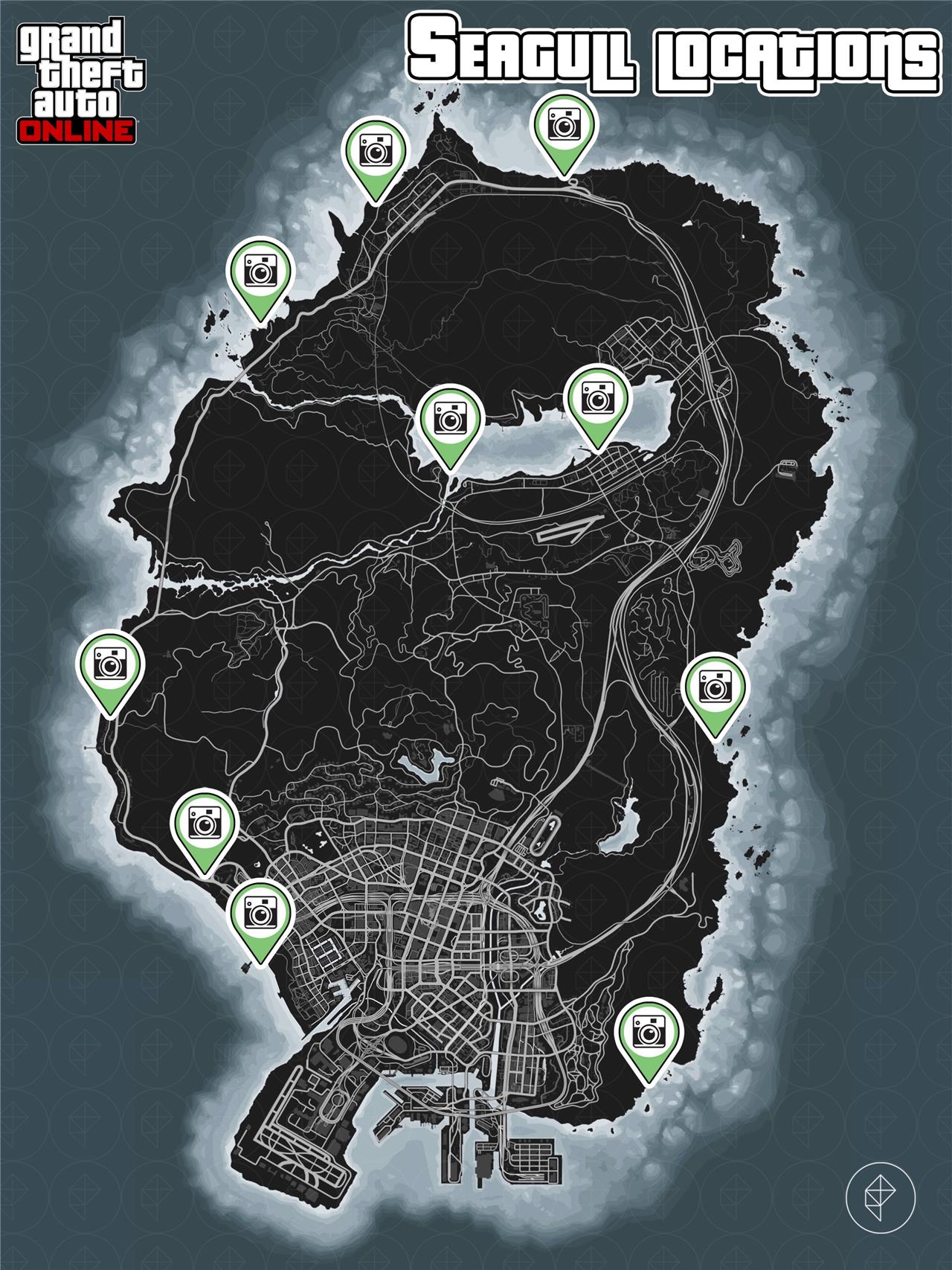 Seagulls in GTA Online can be found primarily along the coastlines during the daytime. Notable locations to spot them include Del Perro Beach, Paleto Bay, Procopio Beach, Sandy Shores, and Vespucci Beach. These birds are commonly seen flying near the ocean and the Alamo Sea, making beach areas the best places to look for them.