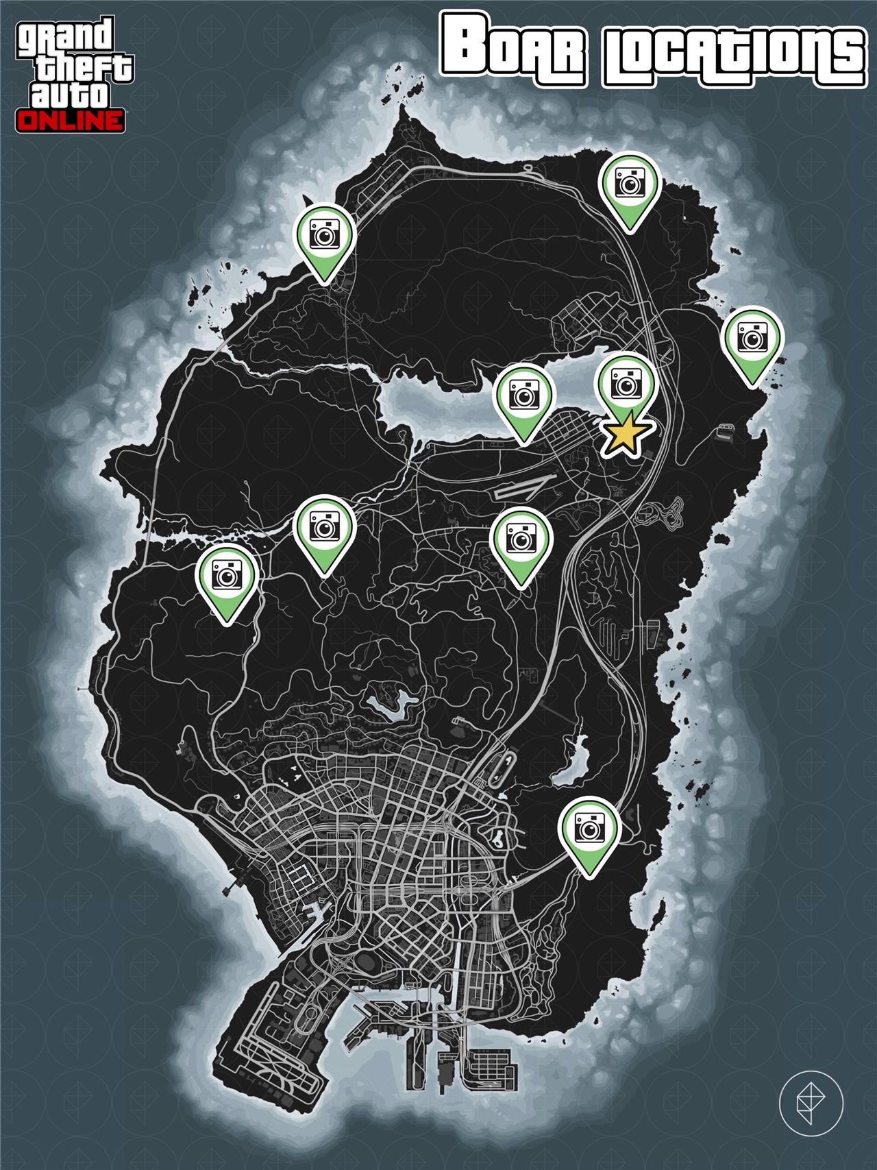 Boars tend to show up in out-of-the-way and hilly areas during the day. A good place to look for a boar is behind the abandoned motel in Sandy Shores.