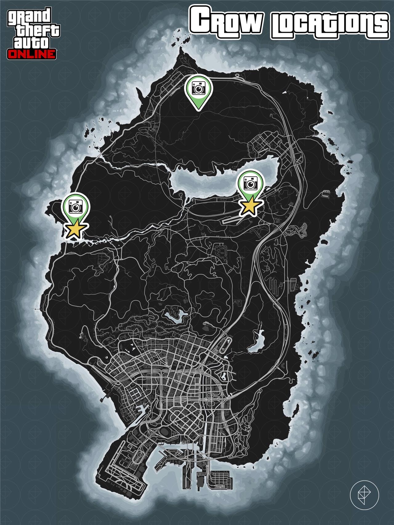 There are only three places that crows spawn in GTA Online – in the east near Sandy Shores, Lago Zancudo in the west, and the peak of Mount Chiliad. They seem to only appear during the day.