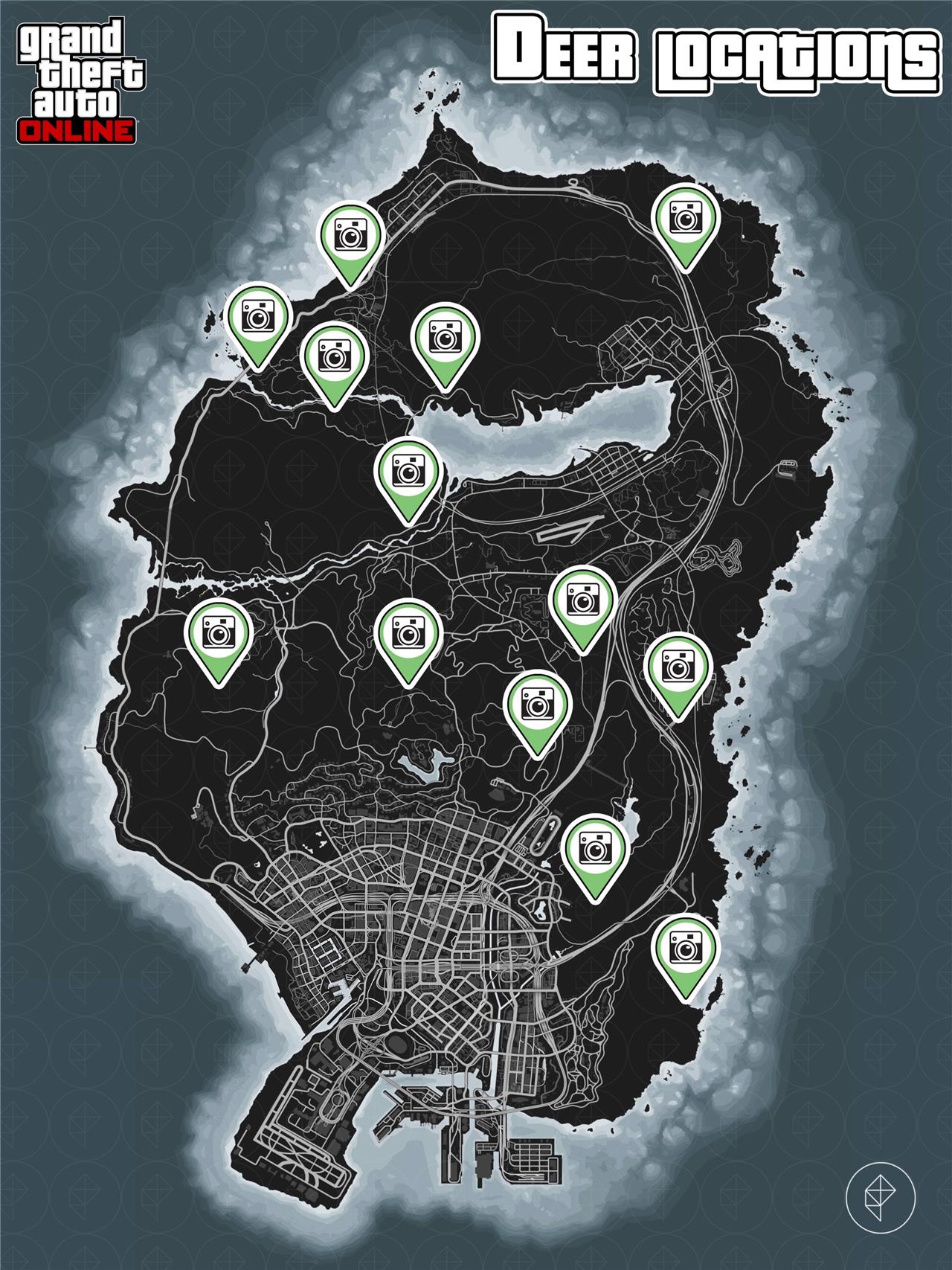 Deer in GTA Online can be found primarily in rural and forested areas outside the city, such as around Blaine County, Chiliad Mountain State Wilderness, and Paleto Forest. They tend to spawn along rural roads and mountainous regions during the daytime, often near places like the military base and Sandy Shores Airfield. Deer are generally skittish and will run away if approached too closely. These locations are ideal for players looking to complete wildlife photography challenges or hunting activities involving deer.
