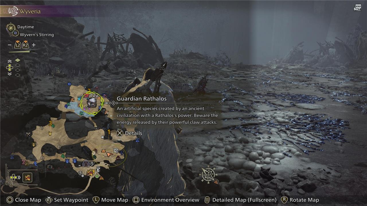 Guardian Rathalos only roams around the Wyveria biome. It can usually be found around 1 and 2. Since Rathalos is flying monster, it’s likely to move, so keep an eye out on the map.