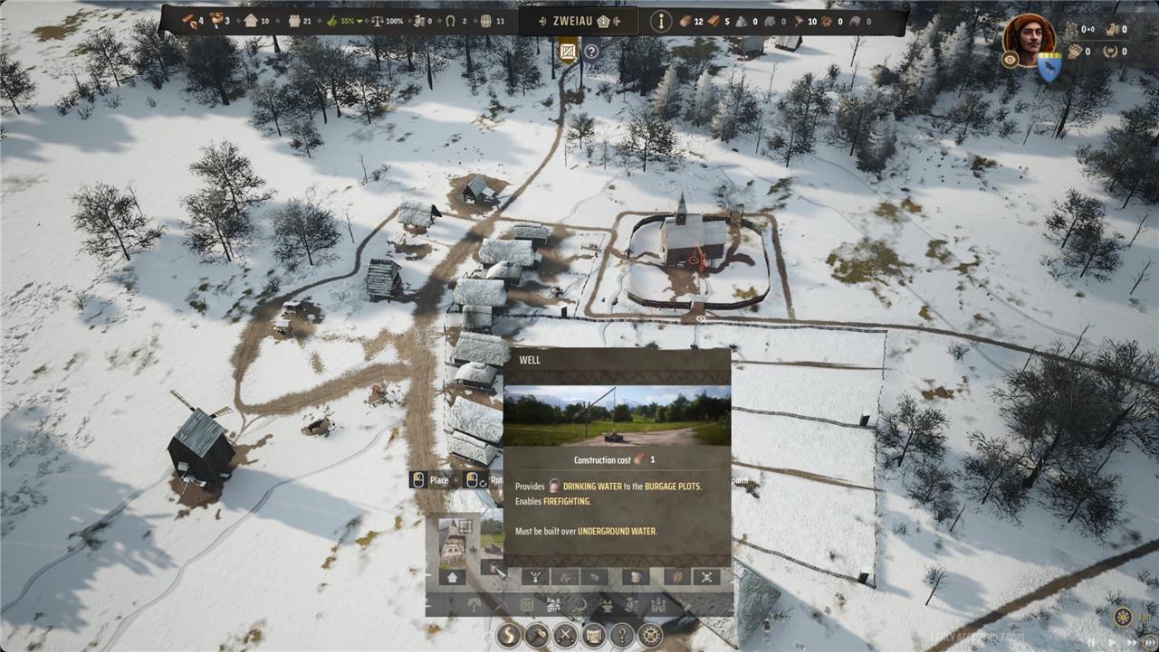 Hit the Construction button and use the underground water overlay to find a spot for your town’s well (1 timber). We kind of forgot about a well (whoops), so the above image is slightly out of order.