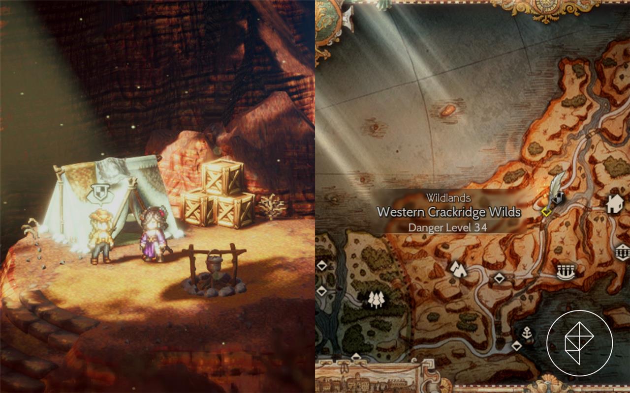 The Merchant secondary job guild sits in the Western Crackridge Wilds, a camp amid rocky terrain on the northern edge of the western continent near Crackridge town. Look for the shield-like icon on your mini-map to spot it while traversing the overworld. Speak to the guild leader there for your first license after reaching around level 30 to handle local threats.