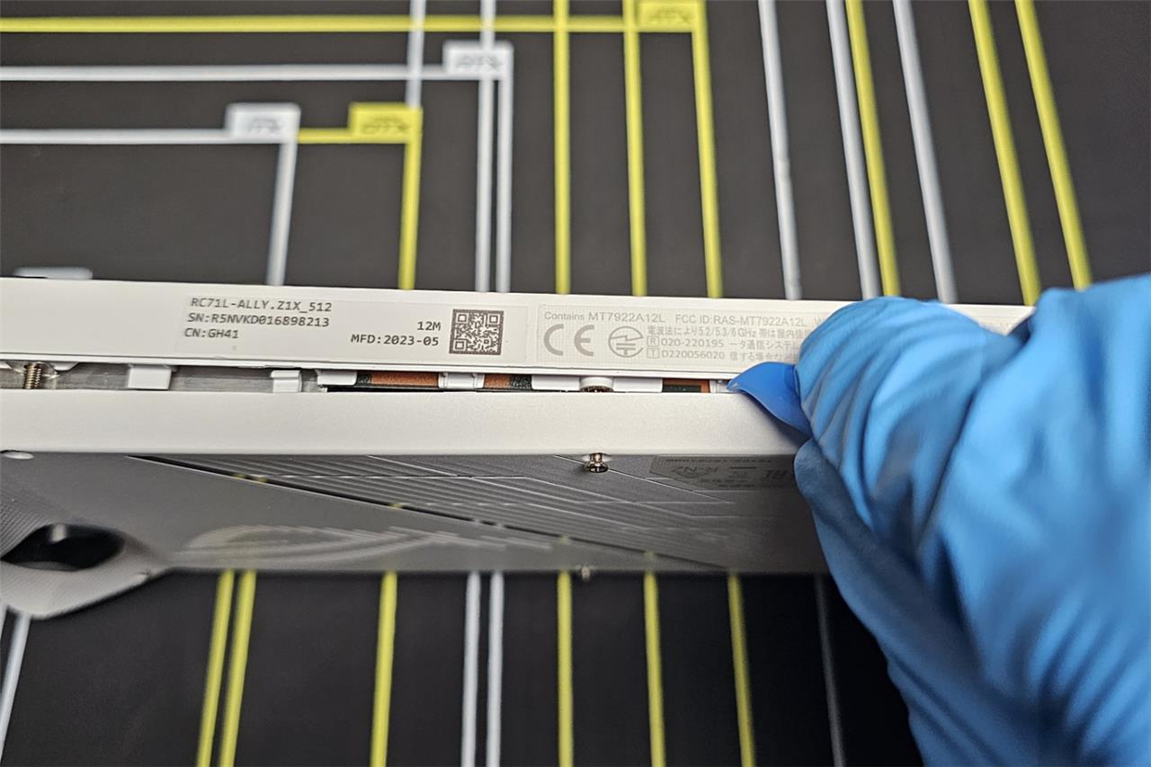 Before doing anything else, you need to disconnect the battery. The instructions are the same for both the ROG Ally and ROG Ally X, even though internally they look a bit different. To do this, simply use the flat edge of a plastic tool to carefully push the metal locking bar away from the connector that’s holding the ribbon cable in place. It’s important that you do not attempt to lift the bar, as this may damage it and prevent it from locking back in place.