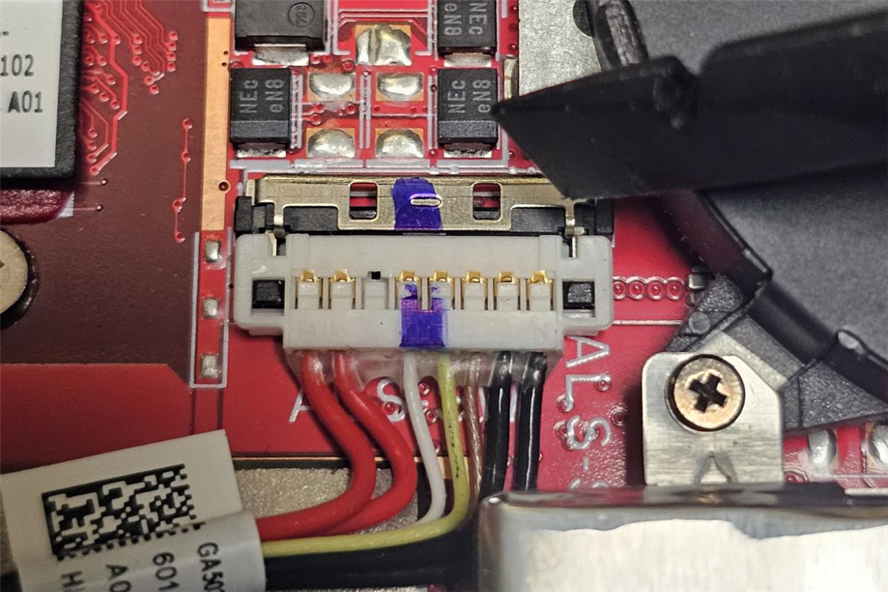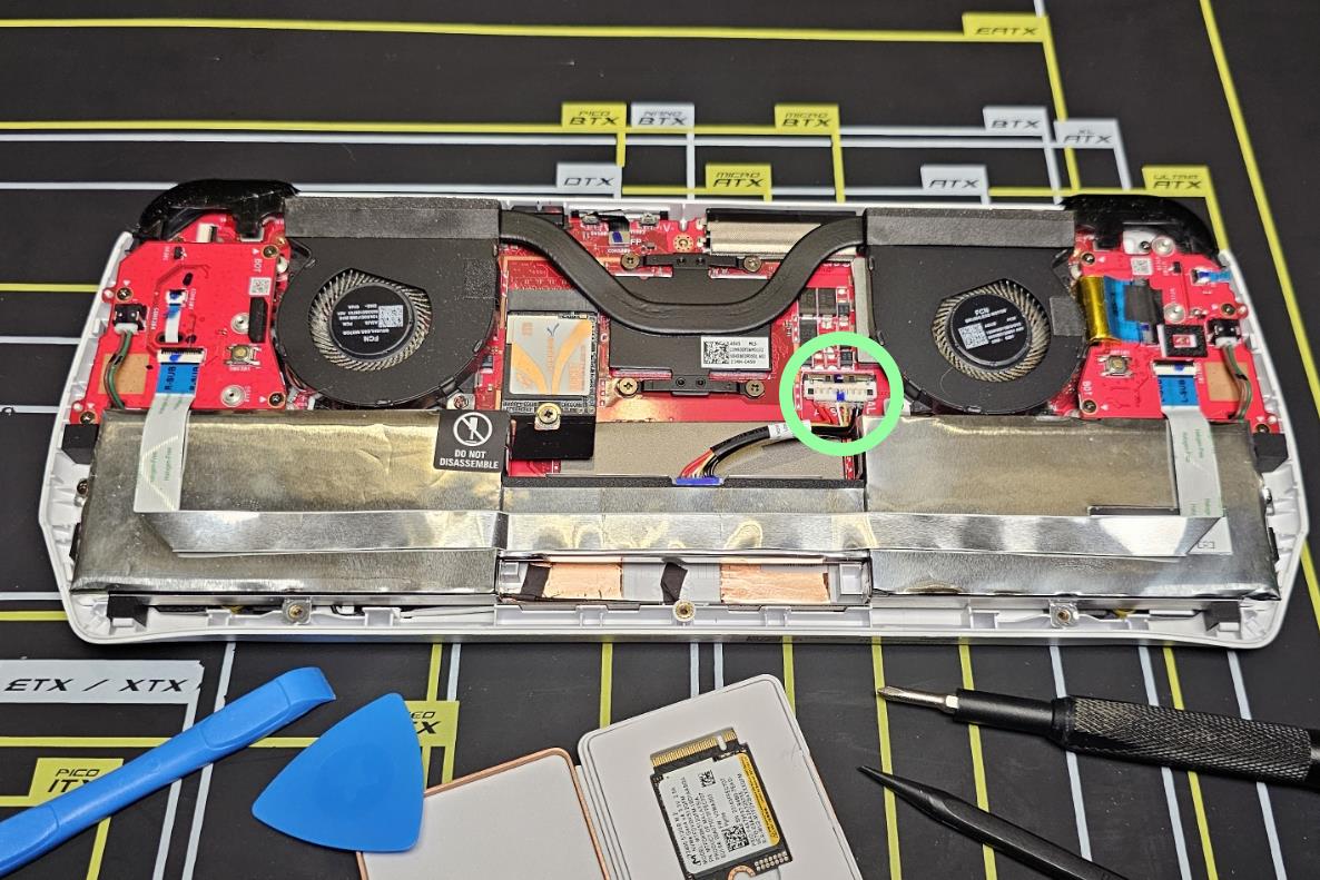 To safely install a new SSD in your Asus ROG Ally, the first crucial step is to disconnect the battery. After removing the back panel and lifting the black vinyl flap between the two fans, locate the battery connector-a white plug secured by a small metal latch. Using a spudger or a plastic pry tool, slide the metal retaining clip back and carefully pull the battery connector upward to disconnect it from the motherboard. This step ensures no power flows through the device during the SSD swap, preventing potential electrical damage and enhancing safety while handling internal components.