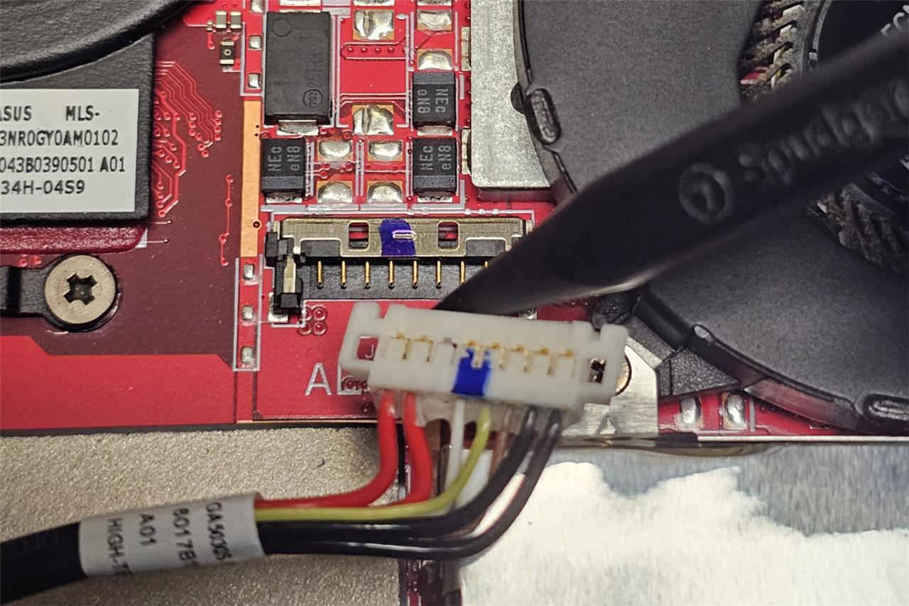 Once the locking bar has been pushed back, use a flat tool underneath the connector and gently lift the cable away from the socket. This shouldn’t take much effort. Once you’ve disconnected the cable from the motherboard, you no longer need to worry about the battery.