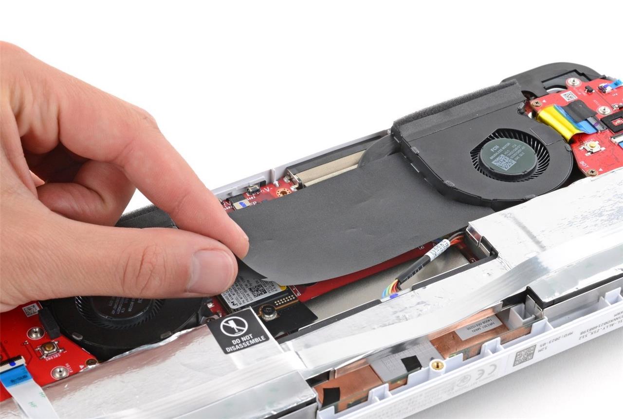 To remove the SSD from your Asus ROG Ally, first power off the device and place it face down on a soft surface. Unscrew the six screws on the back panel-three along the top and three along the bottom-and carefully lift off the bottom cover, using a plastic pry tool if necessary to release the clips. Next, disconnect the battery by sliding back the metal retaining clip on the battery connector and gently pulling it out to ensure safety. Underneath the black flap between the fans, locate the SSD secured by a small screw. Remove this screw, then carefully slide the SSD out at a slight angle, avoiding excessive force to prevent damage. Keep the screw safe for reinstalling the new drive. After removal, you can proceed with installing your new SSD by reversing these steps.