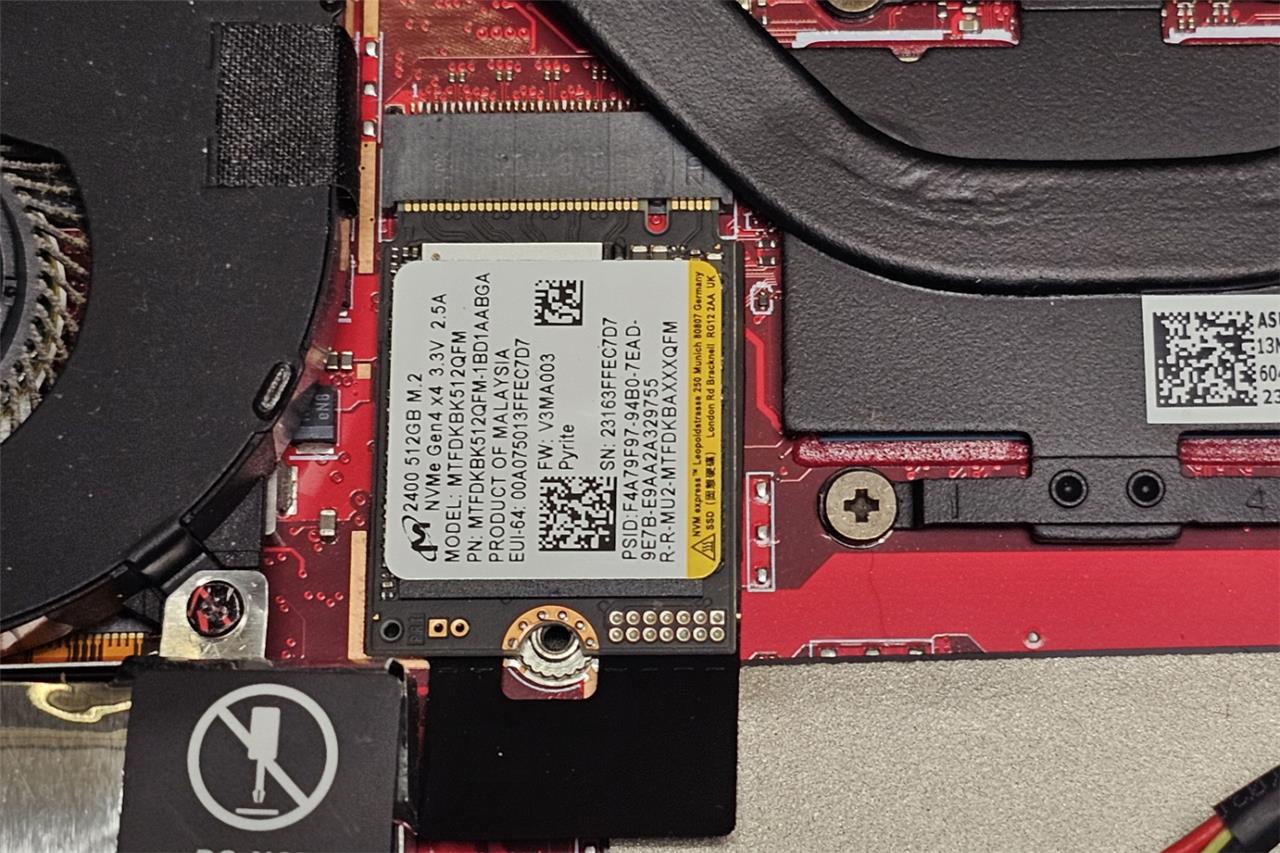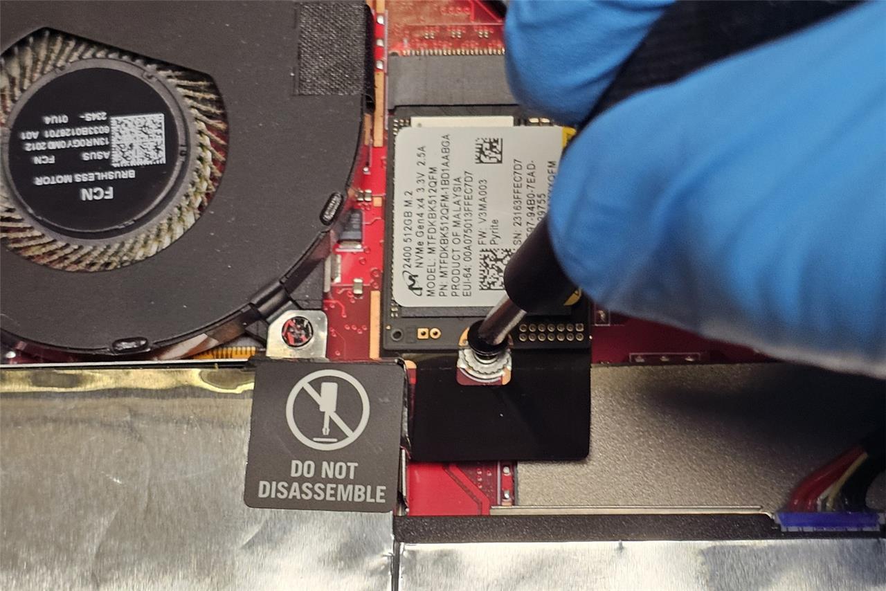 It’s time for the main event. Underneath the black sheet of plastic, the original SSD that came with your device will be visible next to the fan on the left side of the Ally (in the ROG Ally X, the rectangular 2280-size SSD is located in the middle of the device, oriented horizontally underneath the battery cable and a removable thermal covering). Using a Phillips #0 screwdriver, remove the single screw that secures the SSD in the M.2 socket. The SSD should lift up a bit, and you can then gently pull the SSD out of its socket. Do not attempt to lift the SSD up as you remove it, as this has the potential to damage your handheld and/or your SSD.