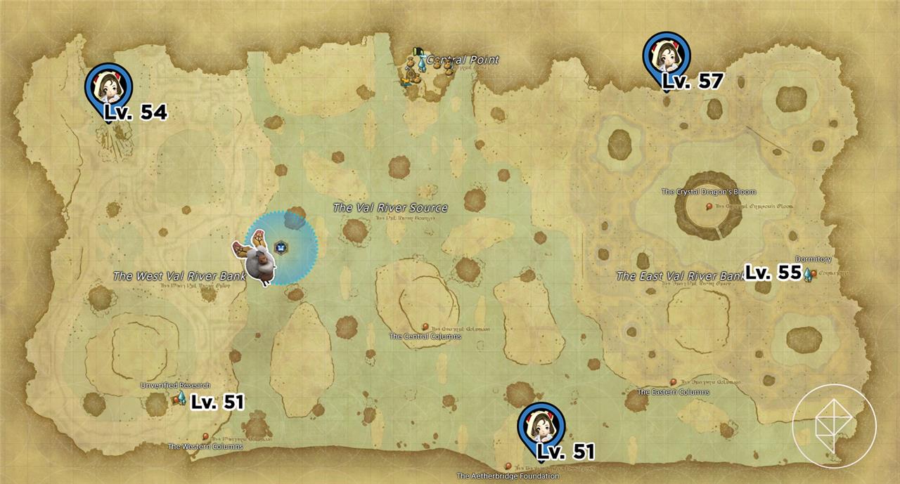 As usual, here’s a map of Krile’s invisible quest locations, the Aethernet Shard level requirements, and the bunny FATE location: