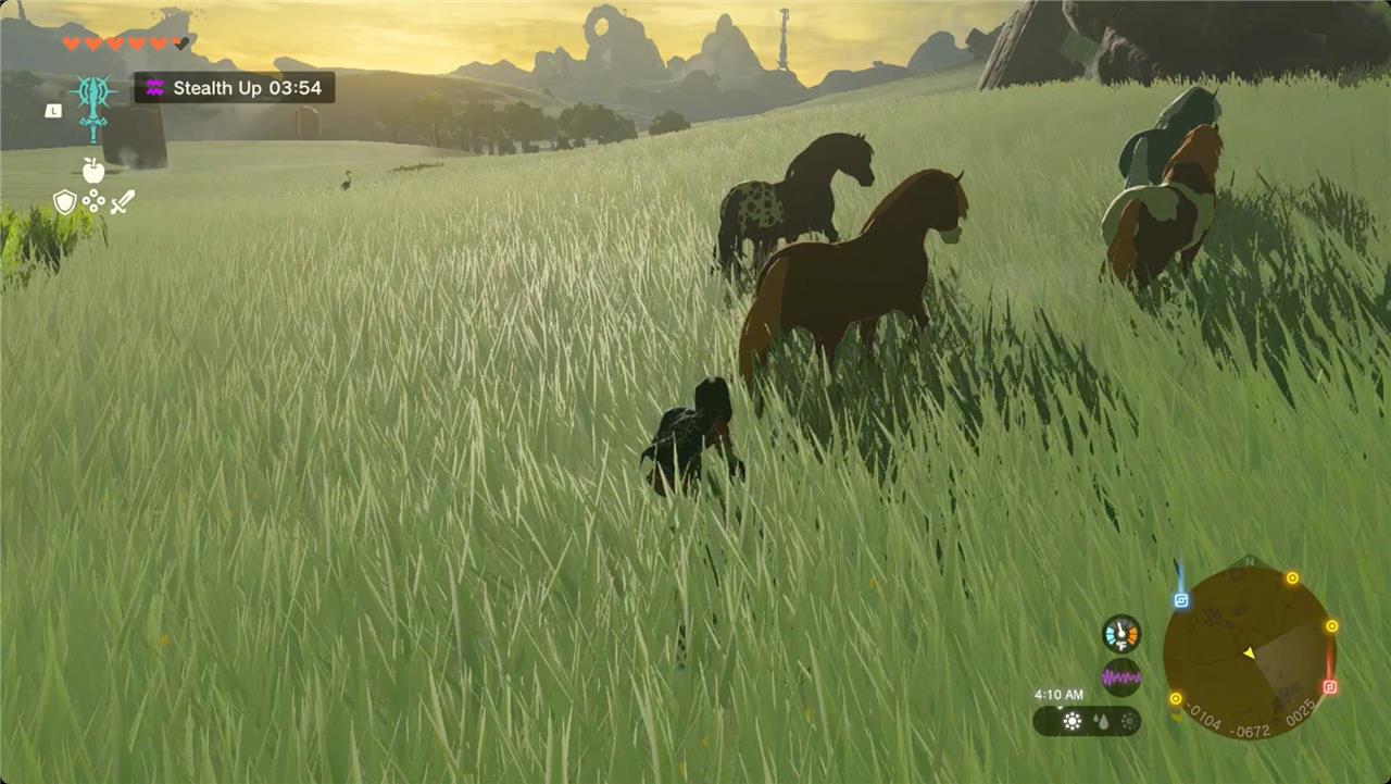 Wild horses can be found roaming across Hyrule’s open fields and valleys, often in small herds. Approach them quietly by crouching and moving slowly from behind to avoid startling them. Using stealth-boosting food or elixirs can make this easier. Once close enough, press the action button to mount, then quickly soothe the horse by pressing the appropriate button repeatedly. Calm the horse until it stops resisting, and you’ll have your new companion ready to register at a stable.