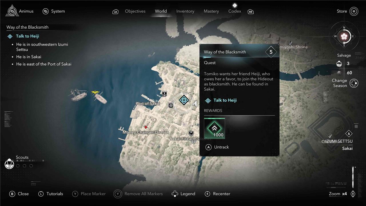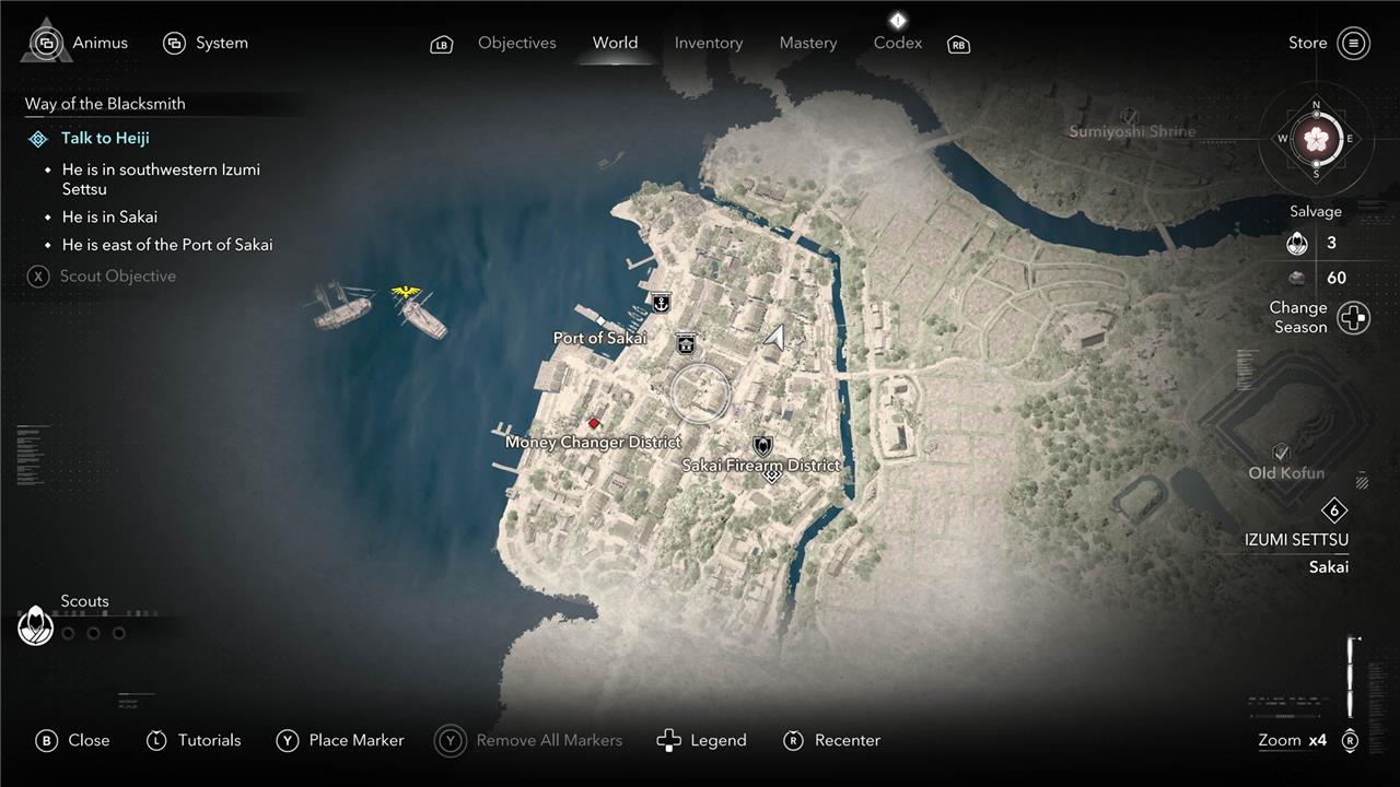 For instance, during the “Way of the Blacksmith” quest, you’re tasked with finding a blacksmith named Heiji. You’re told that he’s in southwestern Settsu, specifically in the city of Sakai, somewhere east of the port. Turn on guided exploration mode, though, and the game will just show you his exact location. See the image below for an example of what the map looks like during that mission with guided exploration turned off compared to on, though note that the second screenshot does give away Heiji’s location: