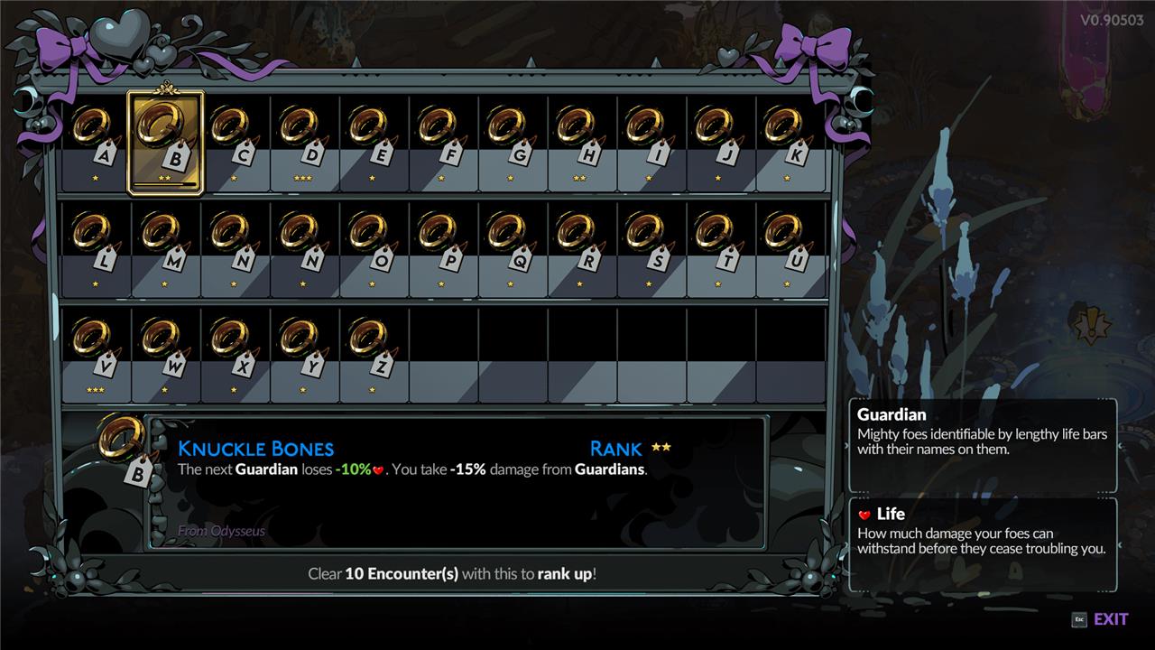 This Keepsake causes you to take 15% less damage from Guardians (regional bosses) and causes the next Guardian you fight to instantly take 5% damage to its health bar, which is incredible. If you use Knuckle Bones a lot, you can upgrade that burst damage as well.