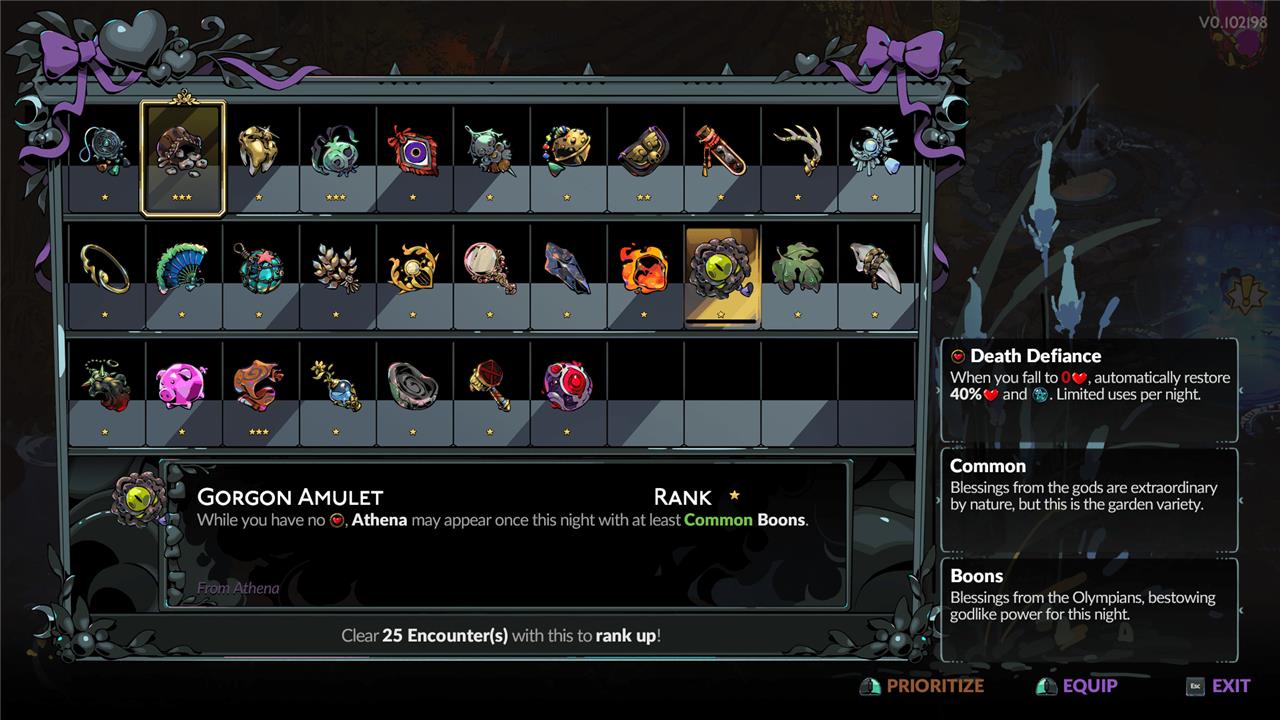 | Athena | Gorgon Amulet | While you have no Death Defiance, Athena may appear once this night with at boons of at least common rarity. |