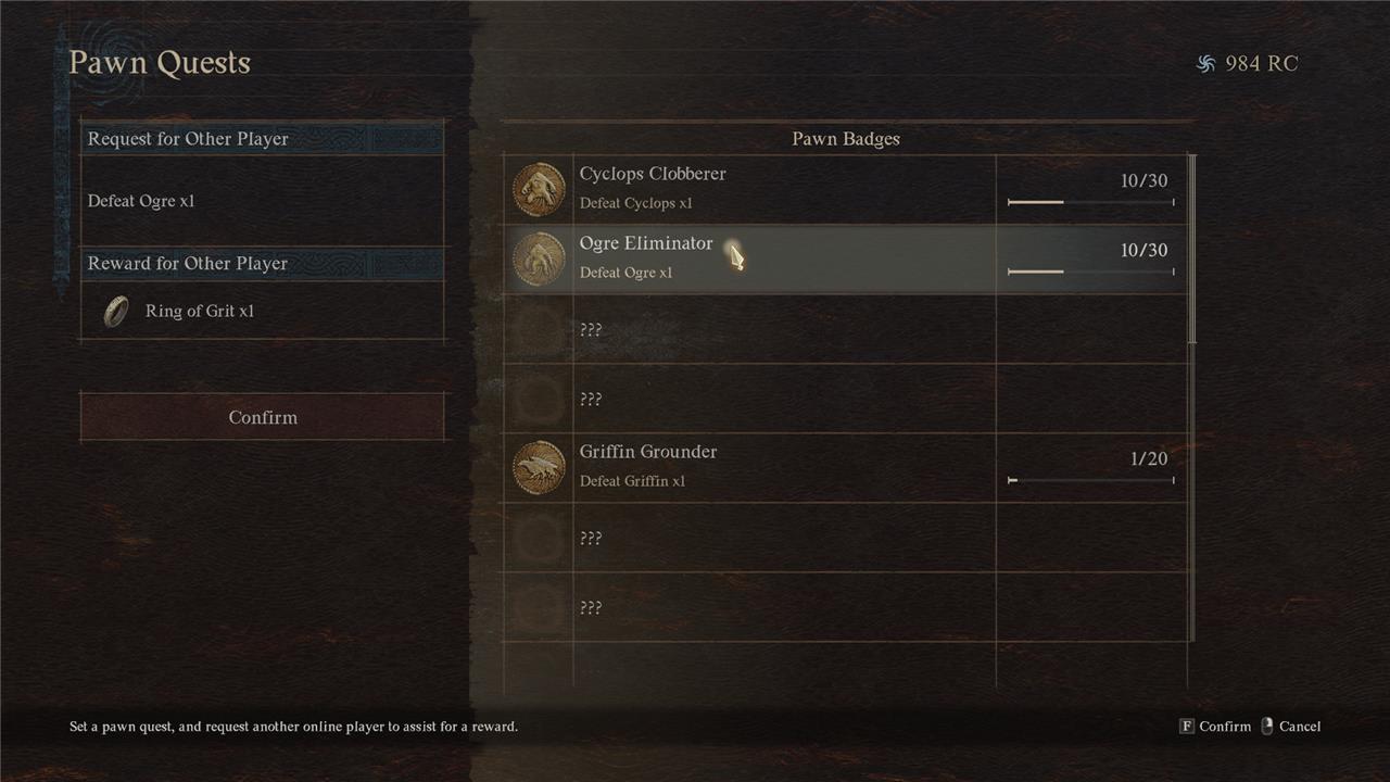Let’s say you want to increase your pawn’s Cyclops Clobberer badge, making them more effective in combat against cyclopes (which is the plural of cyclops, apparently). Set up your pawn with a cyclops hunt quest and offer something desirable as a reward, like gold. Chances are, an Arisen going on a cyclops hunt will grab your pawn to help them out so they can fulfill the quest and earn a payday. Or, if you’re just looking for some RC, set a really simple quest for your pawn and offer a decent reward. An Arisen might grab a lower level pawn if they come with a guaranteed bonus.